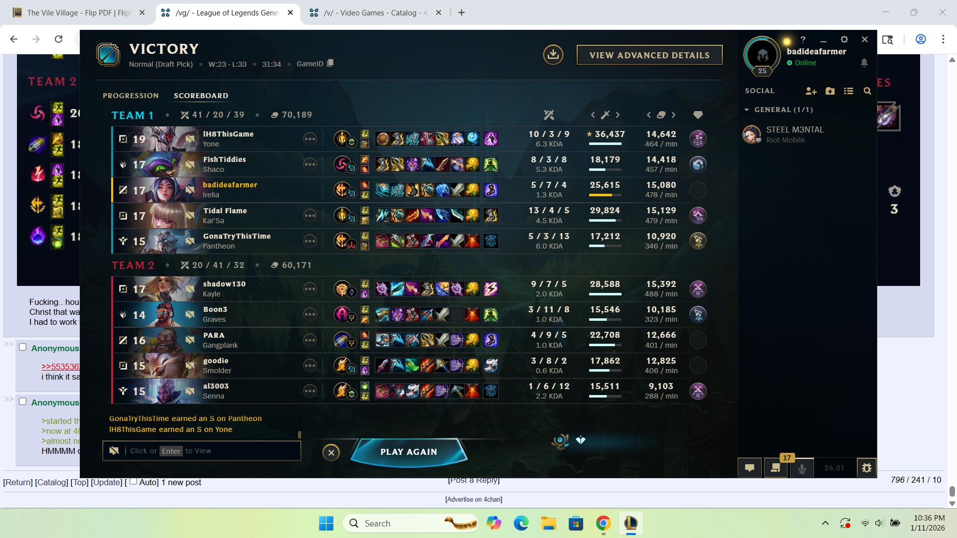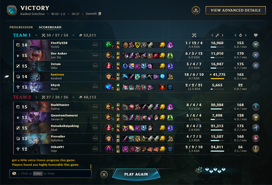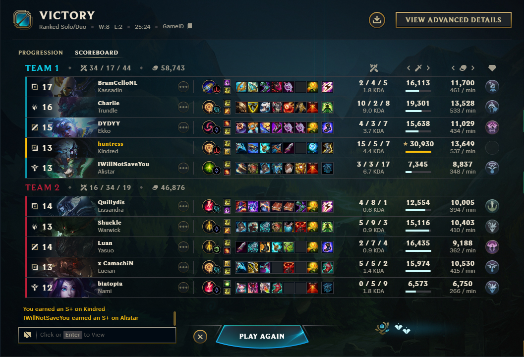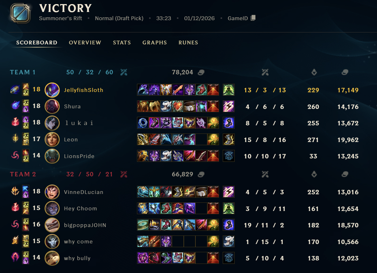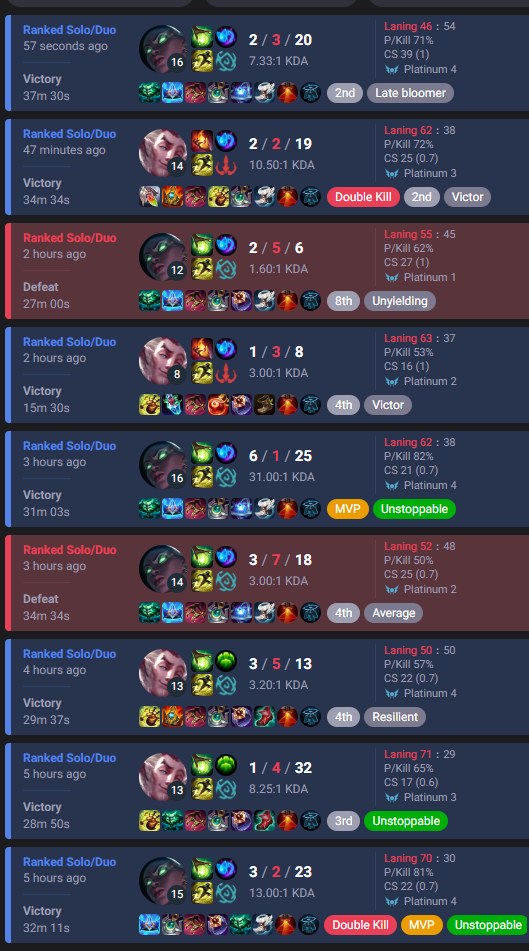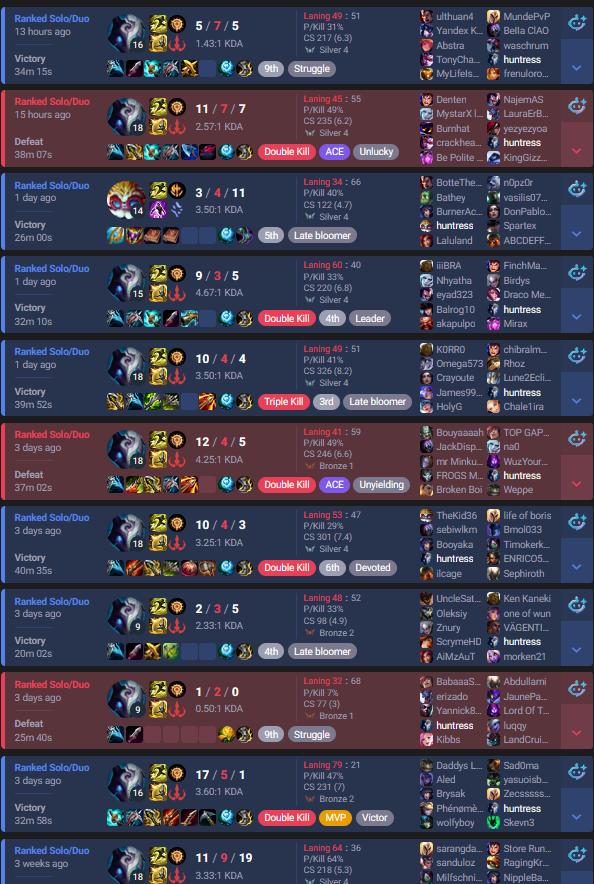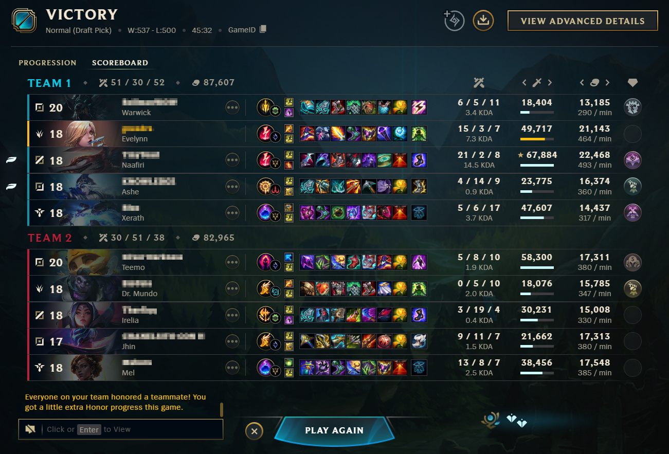 >>553537464>so many people have said this including riot augustSmall take about this. I think many people have been gaslit by Azzap in this regard and I think he is a bad actor on the matter, even if he does occasionally have an insightful perspective. Maybe it's because he is Challenger or something, but we know even Challenger and pro players have questionable takes on the state of the game.>the reality is that 50% achieved by autofilling and matchmaking optimiziation methods is bullshit>the first tiem i climbed to diamond i had 7 games in a row where my opponents were autofilled on the same role,first timing random champsMatchmaking optimisations are indeed a thing and they do work by also shuffling autofills. I'm lower than your rank but I do know I sometimes play bad, occasionally more than bad, but I also notice (because I play too much so patterns begin to show up) that the game will arrange lobbies in such a way, that one of the teams is more competent just as hinted earlier. I check the teams on occasion: sometimes it's the lv30-50 account with suspicious good scores winning more often than losing. Sometimes it's the account with much, much more playtime, with alright scores considering the games but also losing more often than the lv30 account. It's there that I realized the game does the same thing to anyone who isn't a closeted Master player: sometimes it gives lobbies where players can play easily, sometimes it gives lobbies that make you lose even if you are playing well. Of course tilting can and is a factor, and I wouldn't really blame anyone for tilting when games can get that awful; your only skill there is recognizing that maybe you should stop queueing.