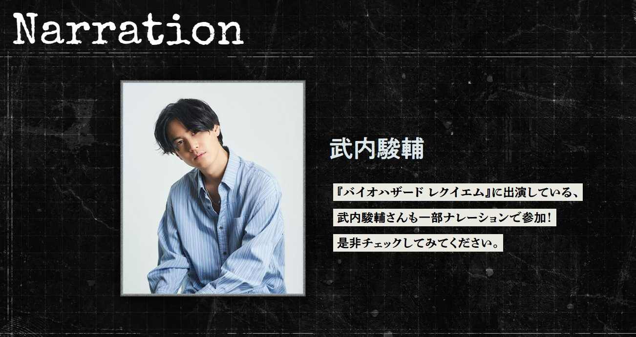 Shunsuke Takeuchi will be RE Showcase´s narrator, he will also participate in RE9 as a voice actorKnown roles: Gonta Gokuhara (Danganronpa), Olaf (Frozen/Kingdom Hearts), Enkidu (Under Night In-Birth), Jamie (Street Fighter), Dr.Ratio (Honkai Star Rail)