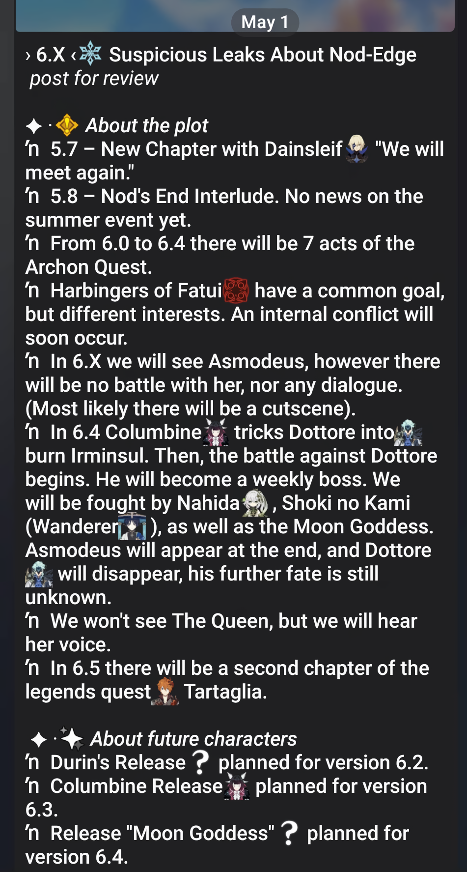 4.x>Arlecchino animated short>Traveler siblings animated short5.x>Mavuika animated short>Skirk animated short6.x>...Sandrone? Varka? Nicole?
