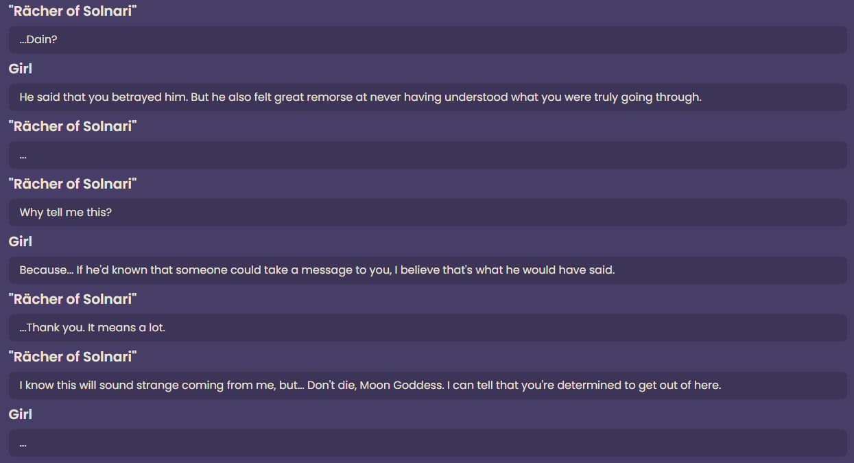 >>553579531> Linnea is an advisor to the Adventurers' Guild. I heard that she has extensive knowledge in the life sciences, so I wanted to ask her if she has ever met any other autonomous mechanical lifeforms like myself. But every time she sees me, she turns around and runs away... Reason: undetermined.>Ooh, Linnea? I really like her! When I was little, she used to tell us loads of cool stories whenever she got back from one of her trips. When I was a bit older, and I'd learned how to build robots, I wanted to give her one as a gift... but she never accepted any of them. She said it was the thought that counts, and that was enough for her — but I think it was because none of them were her style. So, I'm gonna keep making robots until she finds one she likes. I know I'll get there eventually!Sounds like she's a robophobe