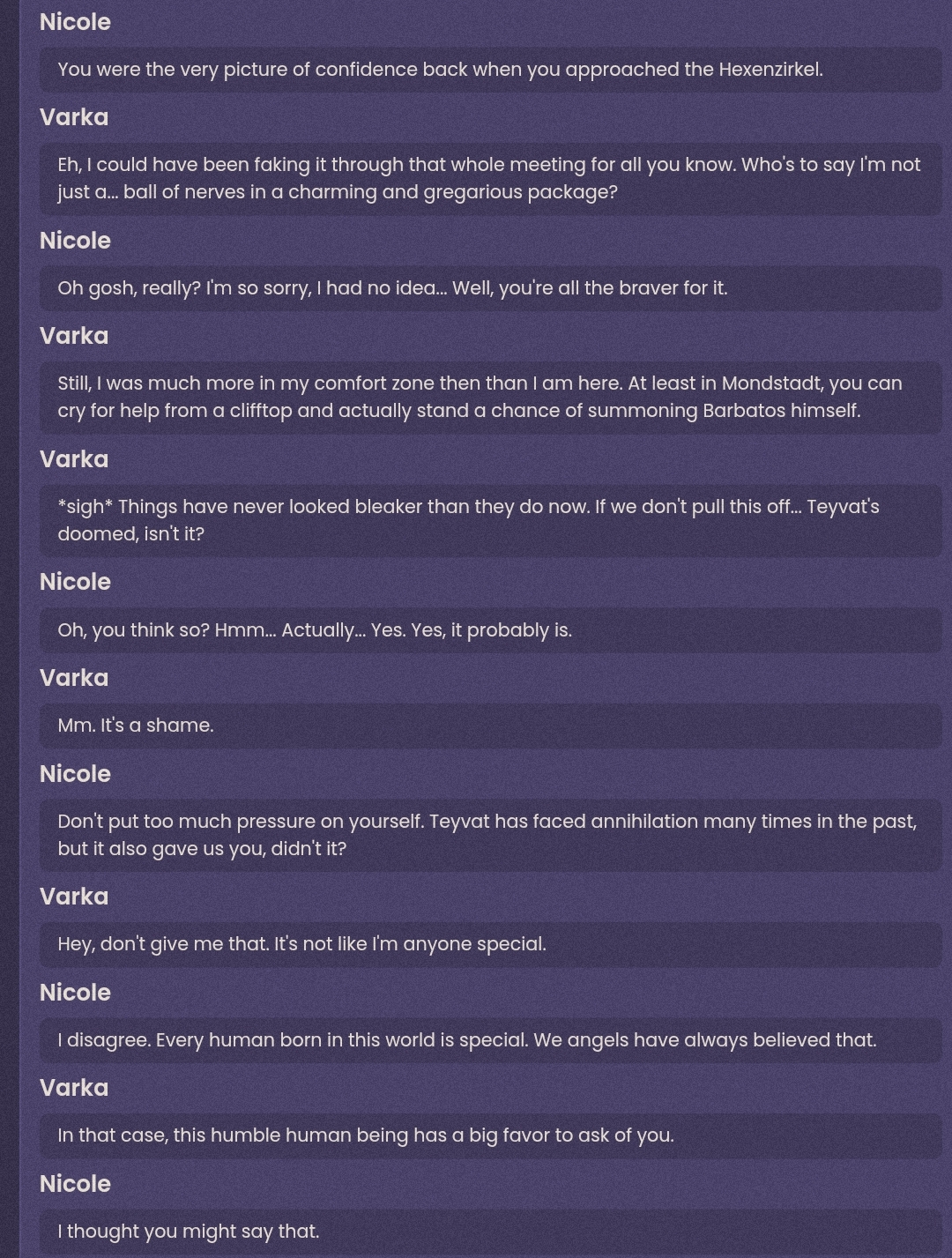 Varka according to /gig/: "He's a CHAD. He's fucking Nicole!!!"Varka in game: He's a comedic relief character who never does anything