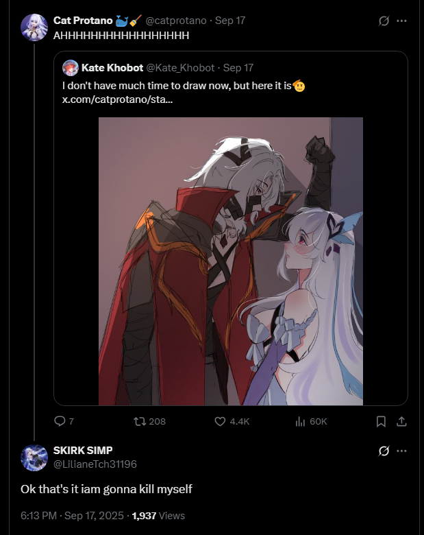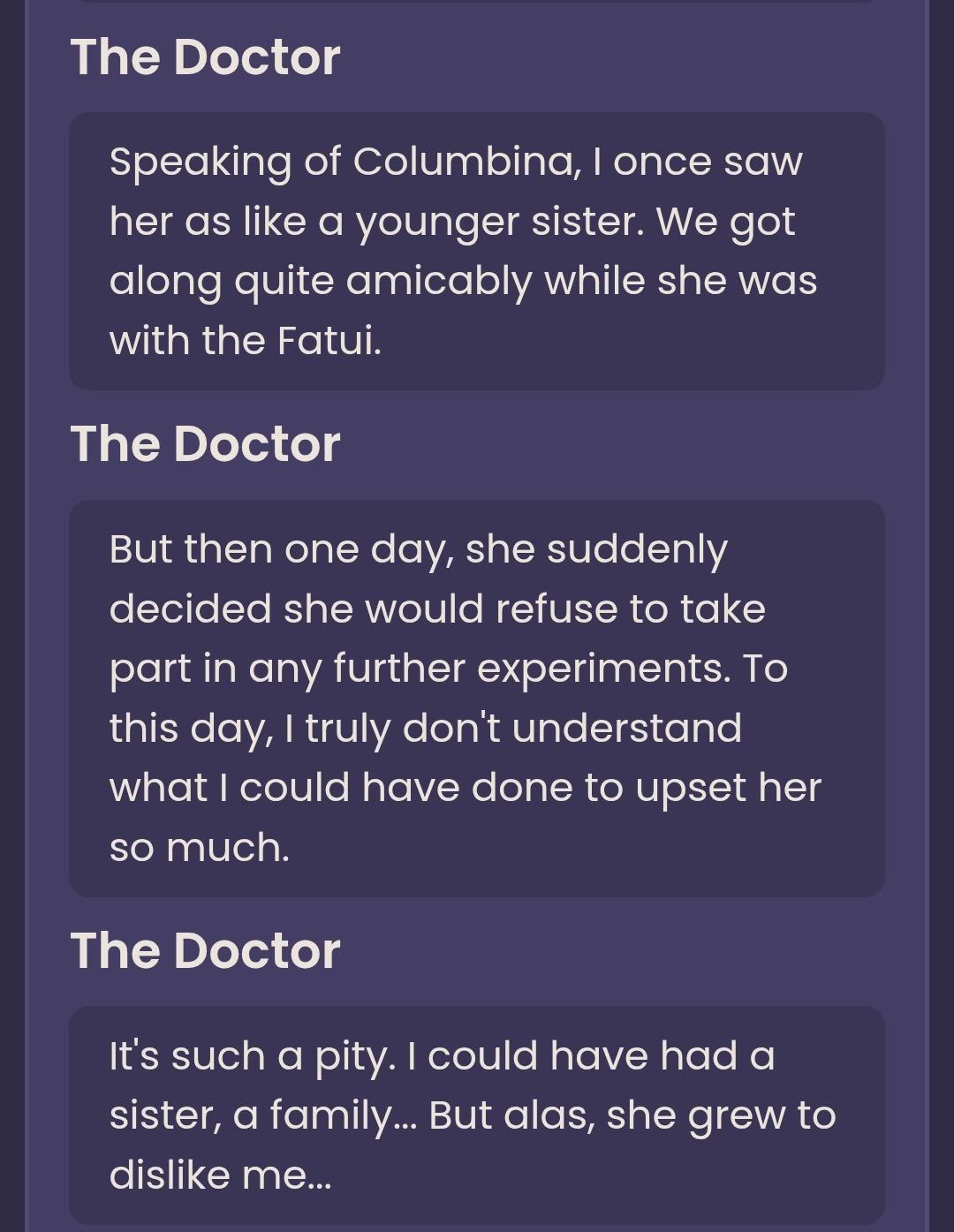 >Build up the Palestar Edict>turns out Tsaritsa was completely tricked just by Dottore into having an arrest warrant for Columbina>none of the other Fatui even put much effort into looking for Columbina so its not like this factored into Dottore's plans at all anyway*sigh*