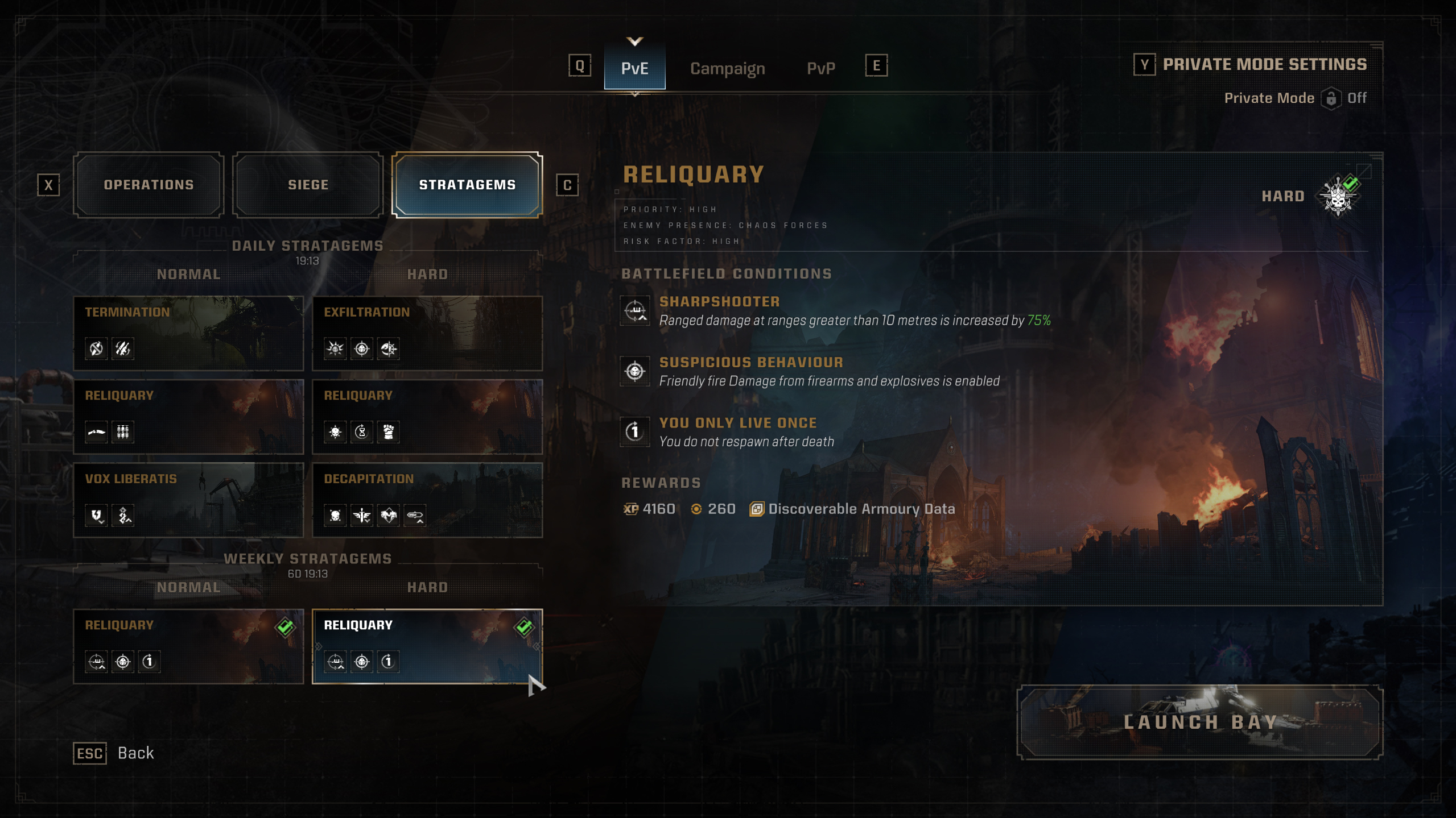 >>55369250314 Jan: ReliquaryYou Only Live Once - You do not respawn after deathSuspicious Behaviour - Friendly fire Damage from firearms and explosives is enabledSharpshooter - Ranged damage at greater than 10 metres is increased by 75%21 Jan: Ballistic EngineCorrosion - Damage received is continuously increased with Mission duration up to a limitAtrophy - You can't die by being Incapacitated, but every Incapacitation will decrease your maximum Health by 25% (limited to 10% of its original value)Unshaken - You do not lose control upon taking Heavy Hits, and you cannot be knocked backCome Prepared - No Medicae Stimms are available, but every Squad Member starts the Mission with 10 stimms28 Jan: InfernoClose In - Ranged Damage is greatly reduced, but Melee Damage is increasedPress the Attack - Not performing a finisher for 20 seconds will start draining your Health down to 30%, but finishers restore HealthUnshaken - You do not lose control upon taking Heavy Hits, and you cannot be knocked backBuffed Enemies - Enemies have increased Health and Damage>>>Reliquiary