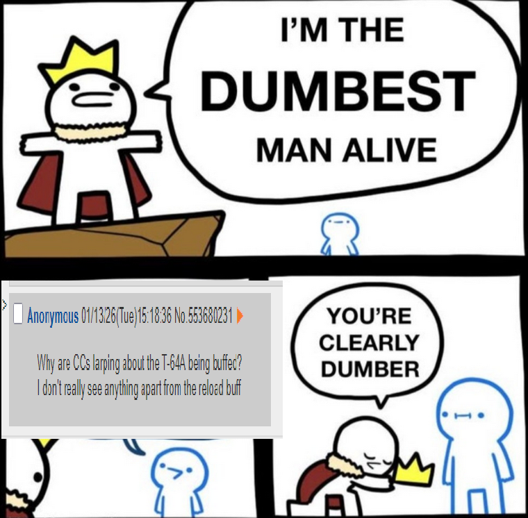 >>553743963The Turm III is obviously undertiered, but it has a global K/D of 1.24, so if they're going by stats it's not opressively strong and forcing an uptier. The T58 sits at 2.26. The only vehicles in the entire game with a better K/D and remotely comparable spawncount are the tech tree BMPT, Object 279 and Coelian. One of those just got nerfed and the other two are very good and at the same time very old (event) vehicles that are predominantely owned and played by competent players.I can't really think of another mass appeal premium doing as well as the T58. The BMPT-72 for comparison sits at a K/D of 1.7.