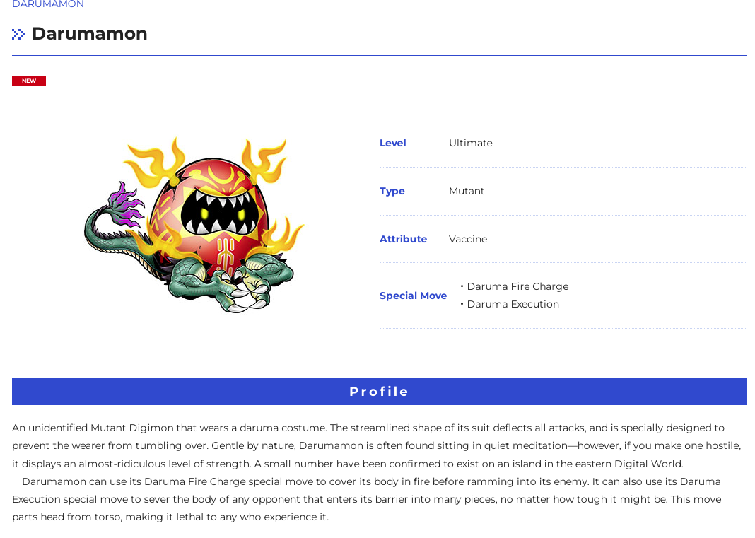 An unidentified Mutant Digimon that wears a daruma costume. The streamlined shape of its suit deflects all attacks, and is specially designed to prevent the wearer from tumbling over. Gentle by nature, Darumamon is often found sitting in quiet meditation—however, if you make one hostile, it displays an almost-ridiculous level of strength. A small number have been confirmed to exist on an island in the eastern Digital World. Darumamon can use its Daruma Fire Charge special move to cover its body in fire before ramming into its enemy. It can also use its Daruma Execution special move to sever the body of any opponent that enters its barrier into many pieces, no matter how tough it might be. This move parts head from torso, making it lethal to any who experience it.