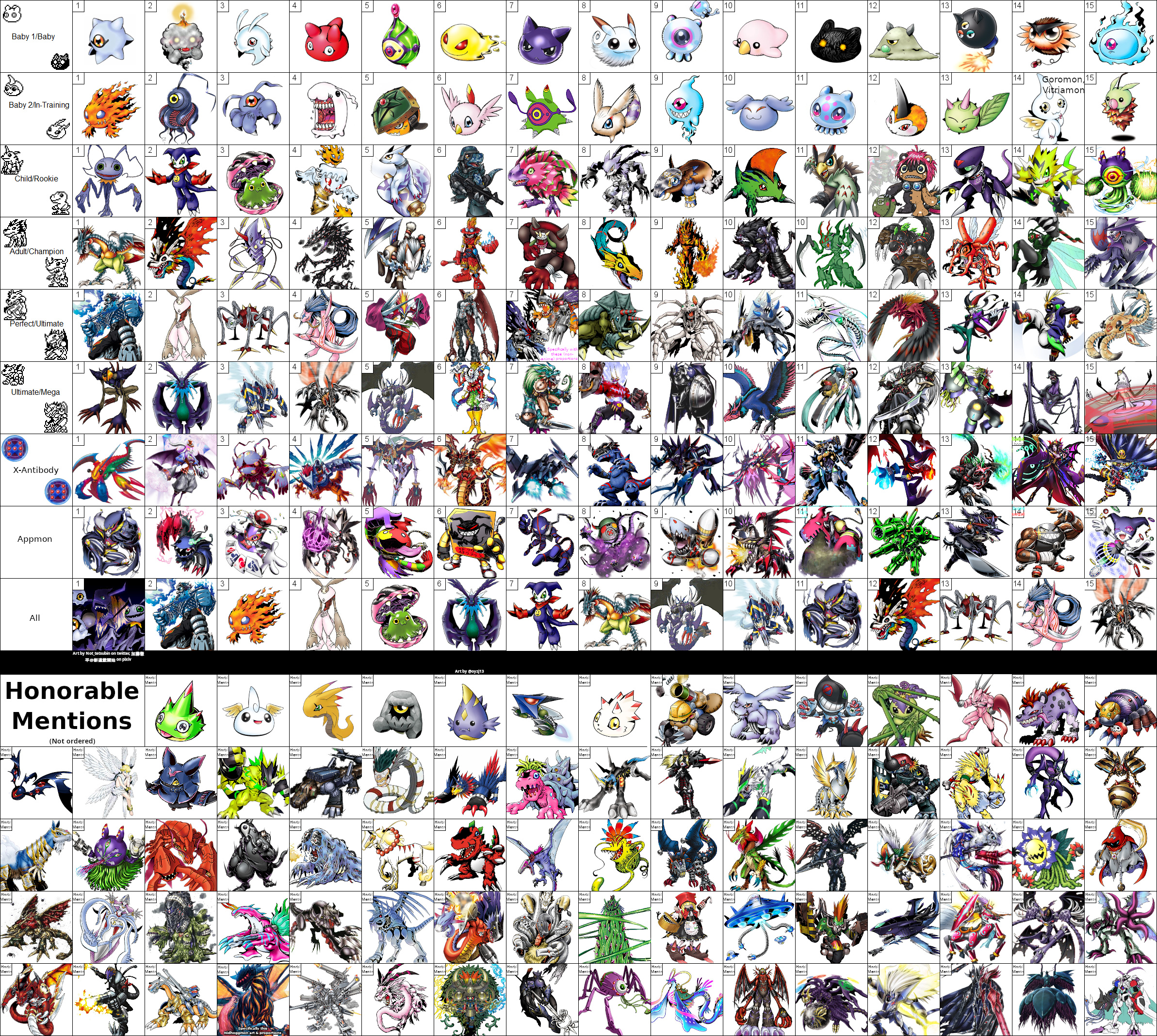 Speaking of Shakomon, it is one of my favorite Digimon, and I finally finished filling out my favorite Digimon chart after working on it here and there for a few yearsAs you can see, I have some consistent favored visual motifs: I love demonic/evil jester designs as seen with Keramon, Impmon, Cherubimon Vice Jokermon, Piemon etc, and I highly suspect Keramon and Cherubimon in "Digimon the movie" established that for me. I also have a thing for ghostly fire, which can be seen in the Meramon line (Deathmeramon in particular I think was a big influence for making it a favorite trope of mine), Flawizarmon Shroudmon, the new ghost babies, and a few other Digimon which didn't quite make the cut like Oboromon and Enbarmon. You can also see how much I love big Lovecraftian tentacle abominations with Diablomon, Arcadimon, Algomon, Quartzmon, etc, and big claws, sickles, or even just hands/arms, with Diablomon again, Snimon, Kyukimon, etc. Lastly, I'm a big fan of Digimon's original 90's punk aesthetic (tons of Digimon I wouldn't otherwise care about I still like such as Elecmon, Gizamon, Greymon etc for this reason though not enough to make it in the chart) and bold bright neon colors, especially green, which is why Shakomon, Pomumon, Pulsemon, Bulkmon etc are here. Beyond that I think most of my favorites are explained by me just being into edgy designs in general. Please rate my tastes and ask questions so the effort isn't wasted.Also let me know if anyone wants the template, I actually was originally filling out a version that had Frontier Hybrid forms, Armors, etc as their own rows but I cut those because I didn't like enough of those designs to fill out those rows much>>553631069>>553631168>>553631246I'm so sick of us getting low resolution artwork. The day they update the reference book with 1000x1000 sized images will unironically be the most hyped I'll ever be for the franchise.>>553616549>>553617178Based fellow Pteramon and Lilithmon X enjoyer