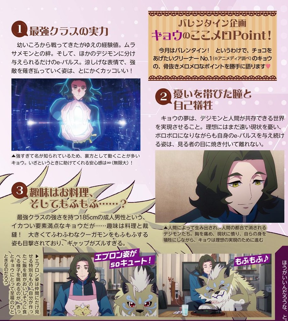 >When Takahiro Kojima, Digimon Beatbreaker's character design, was asked about an order from Series Director Miyamoto that left a lasting impression on him, it was a request for Kyo to be "sexy". He had to ask "What even is sexy?">Originally, Kyo didn't have wavy hair, and his eyes were more slitted, giving a clear sense of there being more to him than he lets on.>But, that design didn't have the "sexiness" the director desired. Parts of this original design ended up being repurposed as a member from the 5 Stars.>Kyo now has has hair that waves during battle scenes, allowing the viewers to see a glimpse of his neck. This is one of Kyo's Sexy Points. An older man that seems to have a hidden side, but is also sexy and you can't help but follow after him with your eyes. This is Kyo.