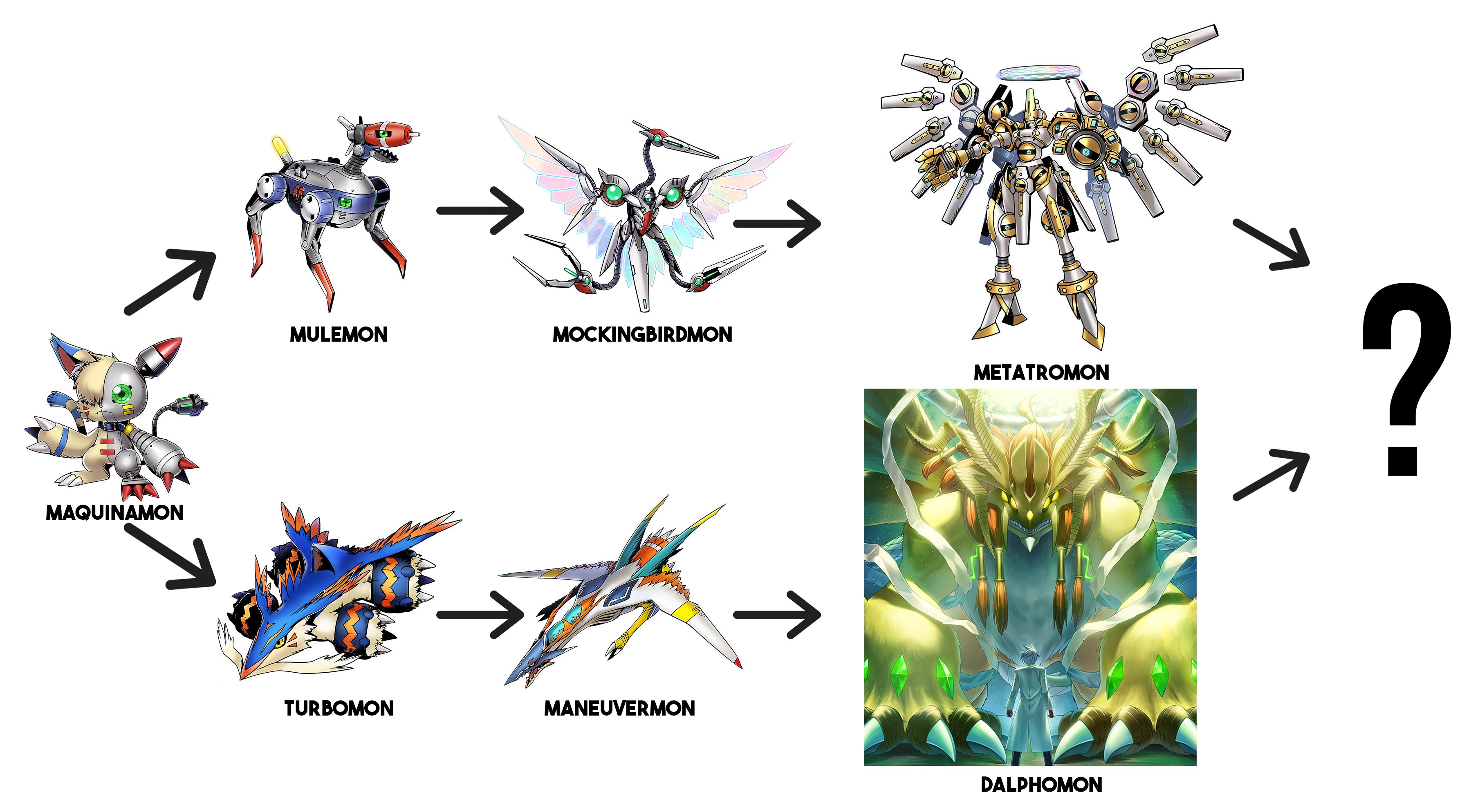 >>553748419Dalphomon explained in the side book that as soon as he opens a gate back to Liberator, a link between it and Metatromon will be established and they'll uncontrollably jogress. In other words as soon as Dalphomon appears in the webcomic, Exmaquinamon will appear a few pages later