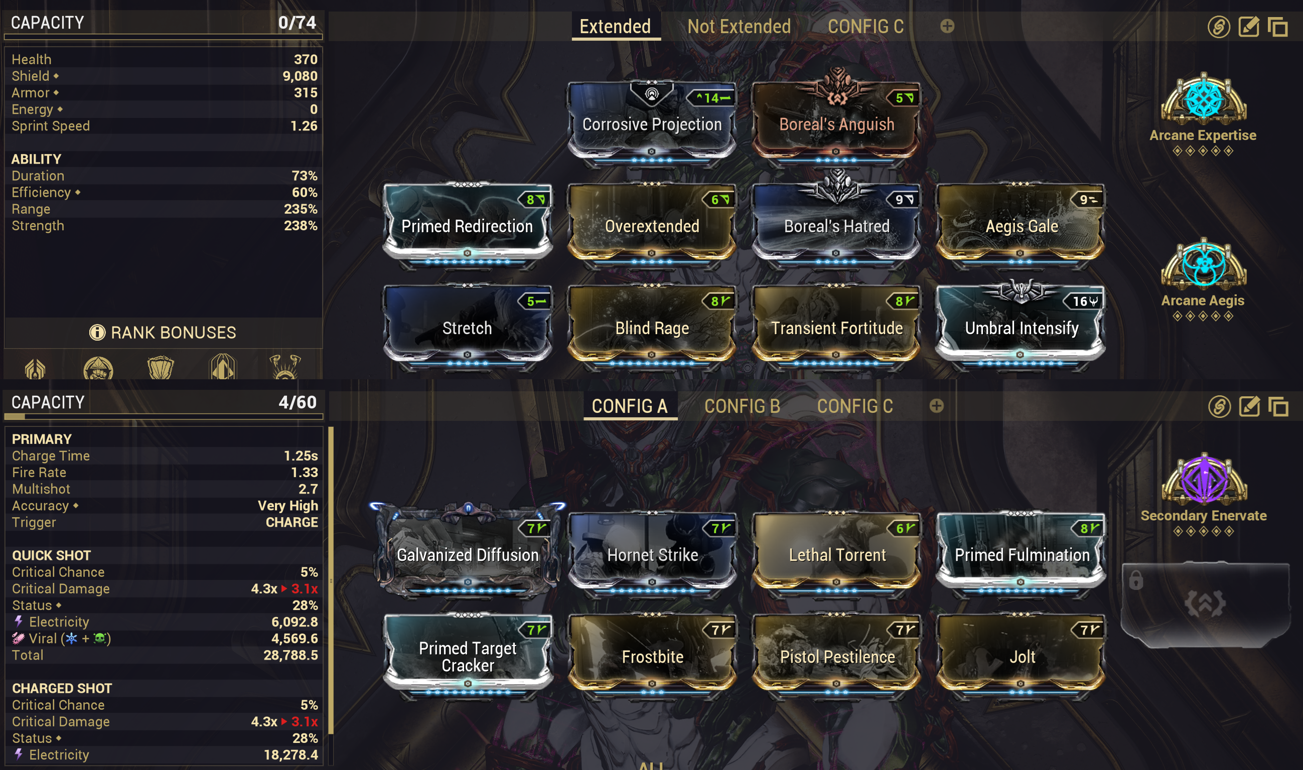 >>553610148Sorry for the delay, I got a call. Here's my Hildryn build.You probably can't learn much about "shield frames" from Hildryn. She's a massive outlier and plays pretty uniquely.Notes about build choices:- To full strip with one cast of Pillage, Hildryn needs either 400% ability strength or 328% and Corrosive Projection. This build has no archon shards, so you could reach 328 by adding 5 tau strength shards and swapping Boreal's Anguish for Power Drift. That much investment isn't necessary for ETA or regular SP, but it's an important breakpoint that this build is very close to. Arcane Expertise lets Hildryn double dip on ability strength, so that would be a pretty significant increase in power even ignoring the Pillage breakpoint.- IMO duration is a matter of preference for Hildryn. Ability drain is tolerable with with enough shield capacity, so duration only affects Pillage. This build is almost max range, so the negative duration is tolerable, especially with Pillage being line of sight.- Arcane Aegis is probably replaceable, but it's extremely comfortable and gives you more wiggle room when enemies start doing more damage. Keep in mind it only protects you from so much, and IMO Hildryn doesn't scale into long endurance missions.- I'm pretty sure multishot and AOE add Enervate stacks without consuming them, so Enervate is the best arcane for a huge AOE like Balefire Charger. Some of this crit damage is coming from Tenacious Bond.- I'm using Jolt because I was being stingy with forma and don't have the capacity for Primed Convulsion. Apparently I've never upgraded a regular Convulsion, and I kind of think it's funny to leave it that way. Raw damage instead of status should be fine for elec and/or viral.- I used to like Blazing Pillage, but you don't need it for modern content and you just shouldn't bring Hildryn for star chart infested.