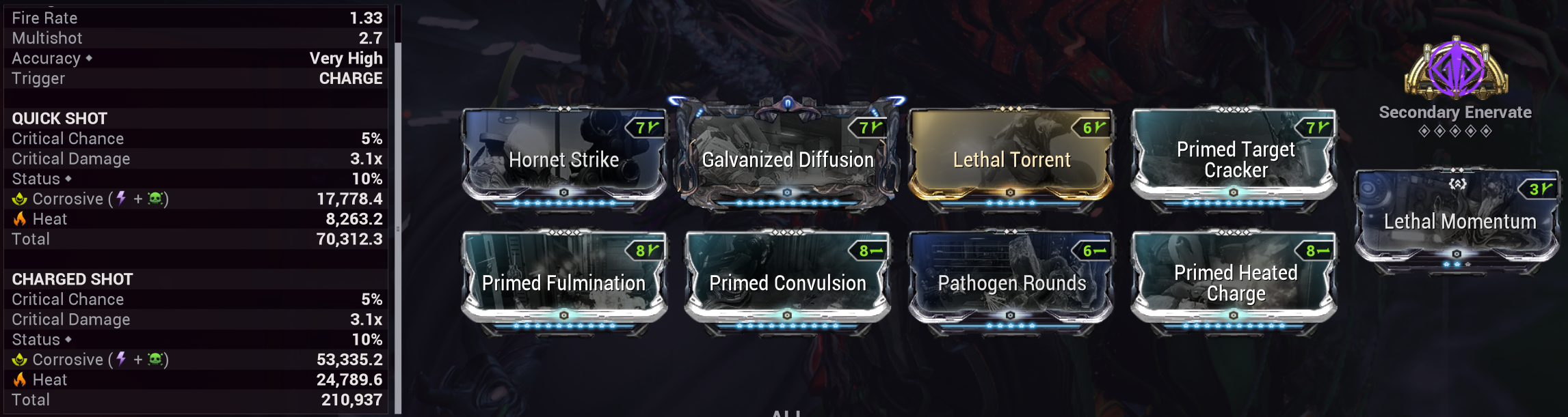 >>553616554the 2 galv modscreeping bullseyevital sensecorrosive + cold 60s (turns into blast on incarnon)deadhead or bulwarkbubble augment if you hate bubbles (all my nezhas hate bubbles)I have a weird dual element riven so I put 1slot magnetic on mine but it makes basically no difference in practice