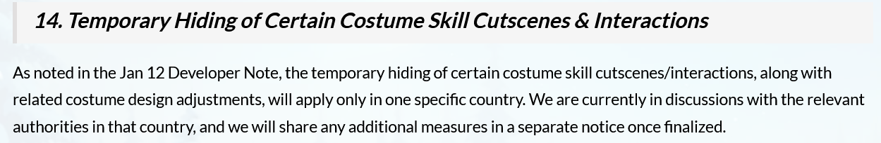 >As noted in the Jan 12 Developer Note, the temporary hiding of certain costume skill cutscenes/interactions, along with related costume design adjustments, will apply only in one specific country.They were throwing everything away for either UK or Australia