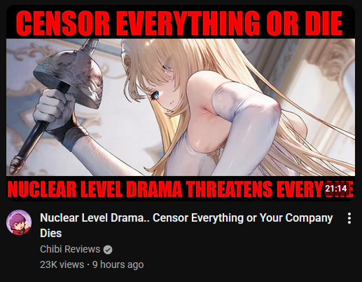 To think were this close to ridding ourselves of the lolifags... Self reporting on pre censoring the blue girl wasn't smart either for multiple reasons, their kind was fully ready to take the censored scraps and pedbaiting won't go well on the App stores... Not to mention that the live stream is just a report into YT account suspension waiting to happen... We wont even know for sure if we beat the censors as stuff might still be getting toned down behind the scenes... Blade ass is gonna have to carry hard for the foreseeable future