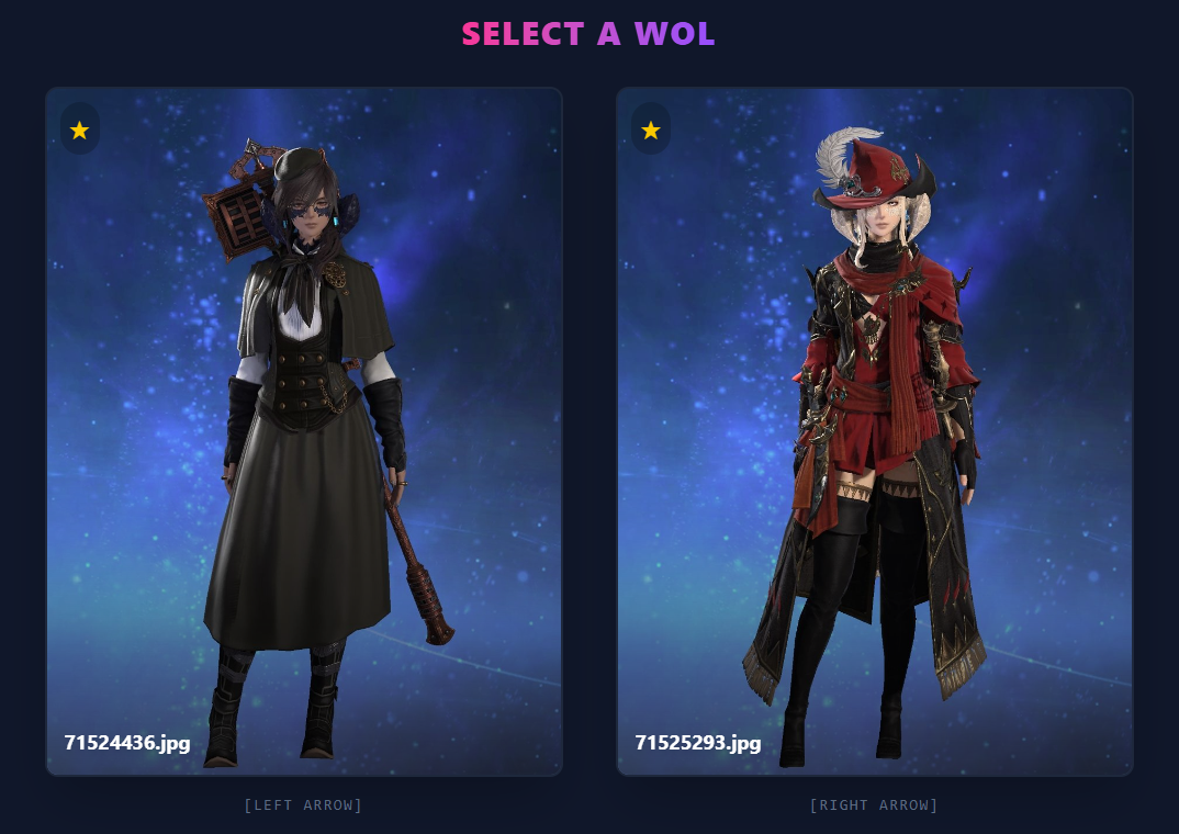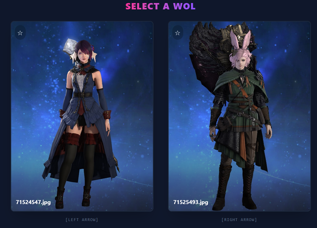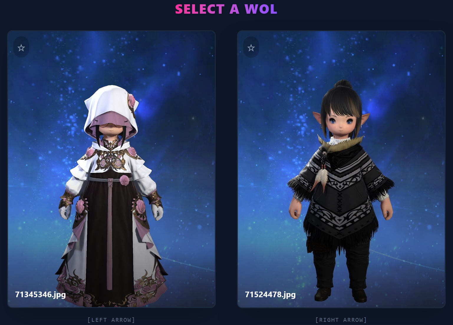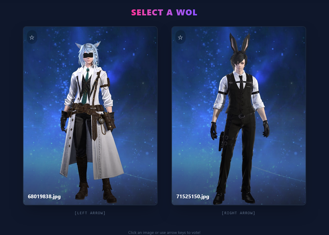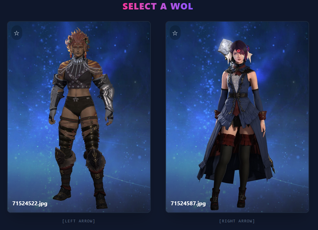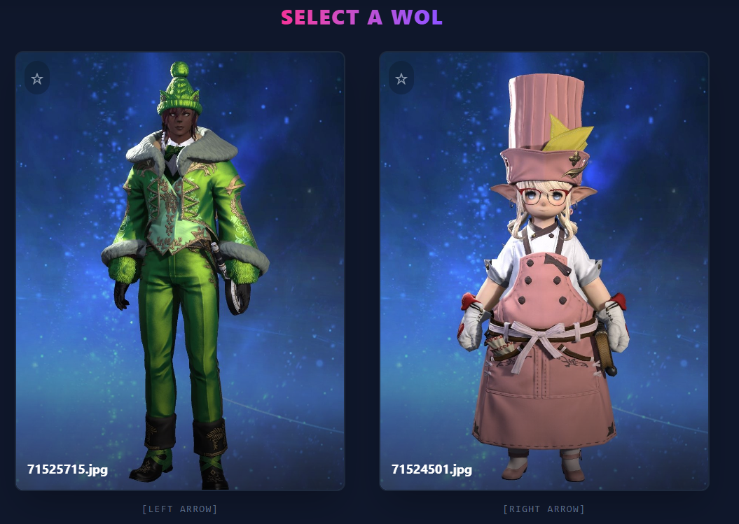 >>553622945This is a very fun idea and I appreciate the option for arrow key selection, but I shall now be hyper aware to not wear my urban outfitters clearance rack to lodestone picture day>>553623598Male characters are a rare breed now and can only be found in the wild or via test tube generation