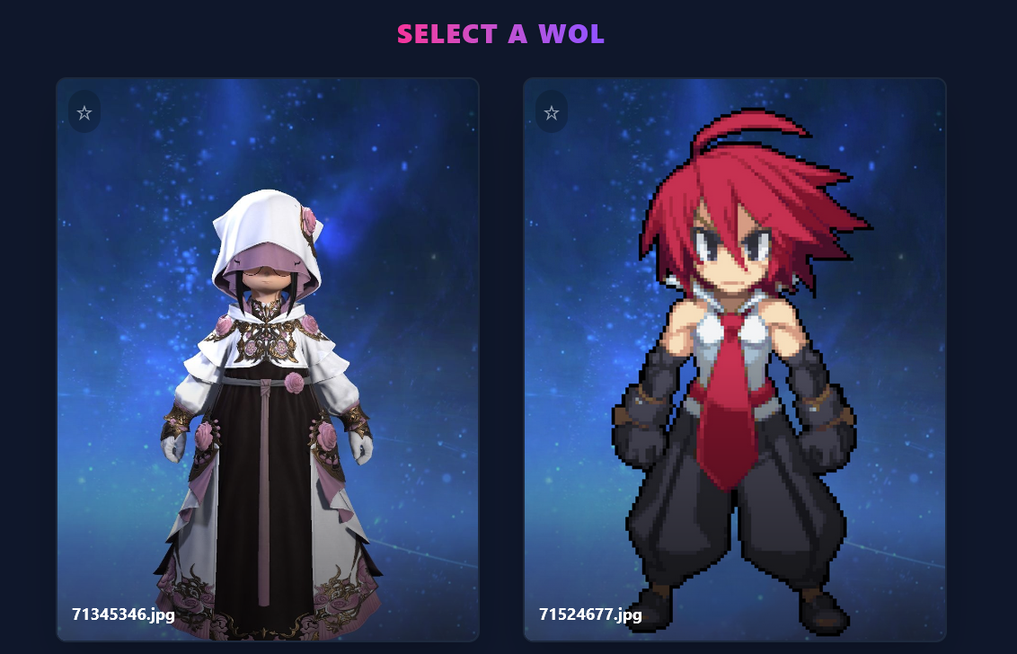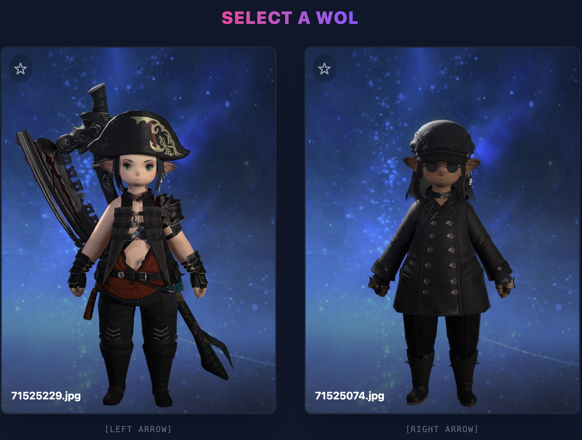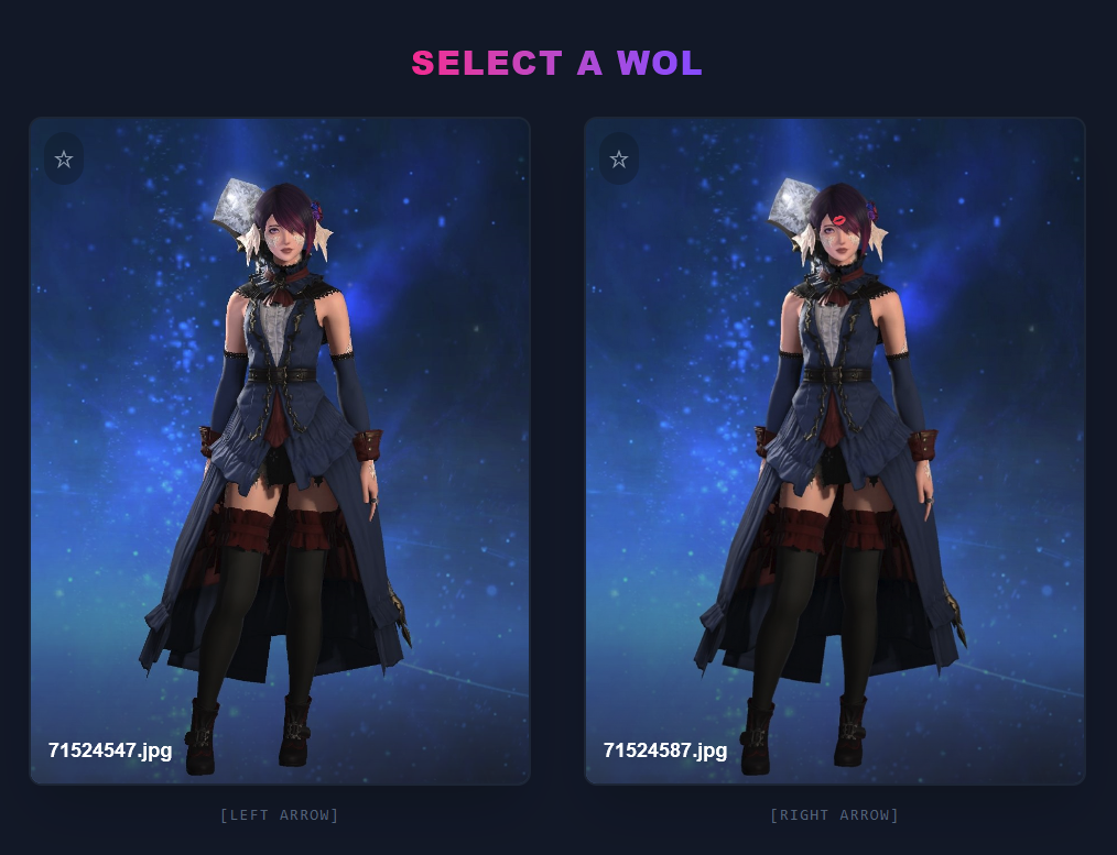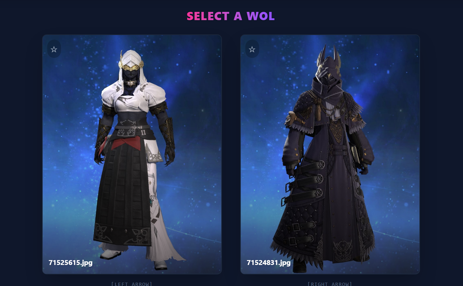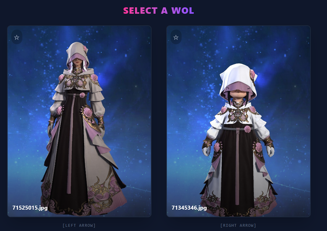 >>553622945This is a very fun idea and I appreciate the option for arrow key selection, but I shall now be hyper aware to not wear my urban outfitters clearance rack to lodestone picture day>>553623598Male characters are a rare breed now and can only be found in the wild or via test tube generation