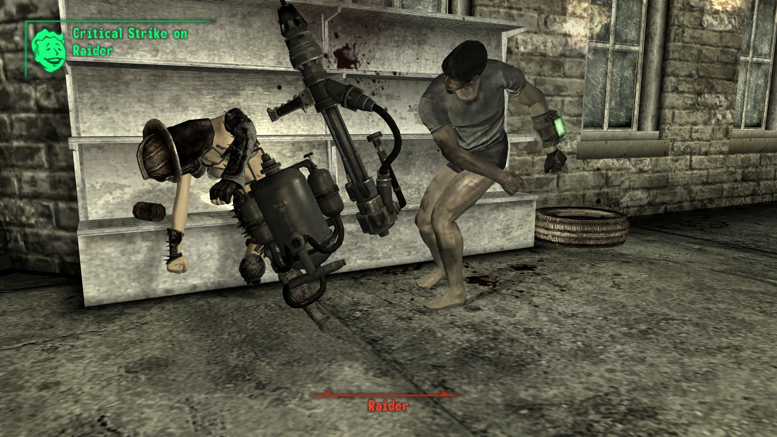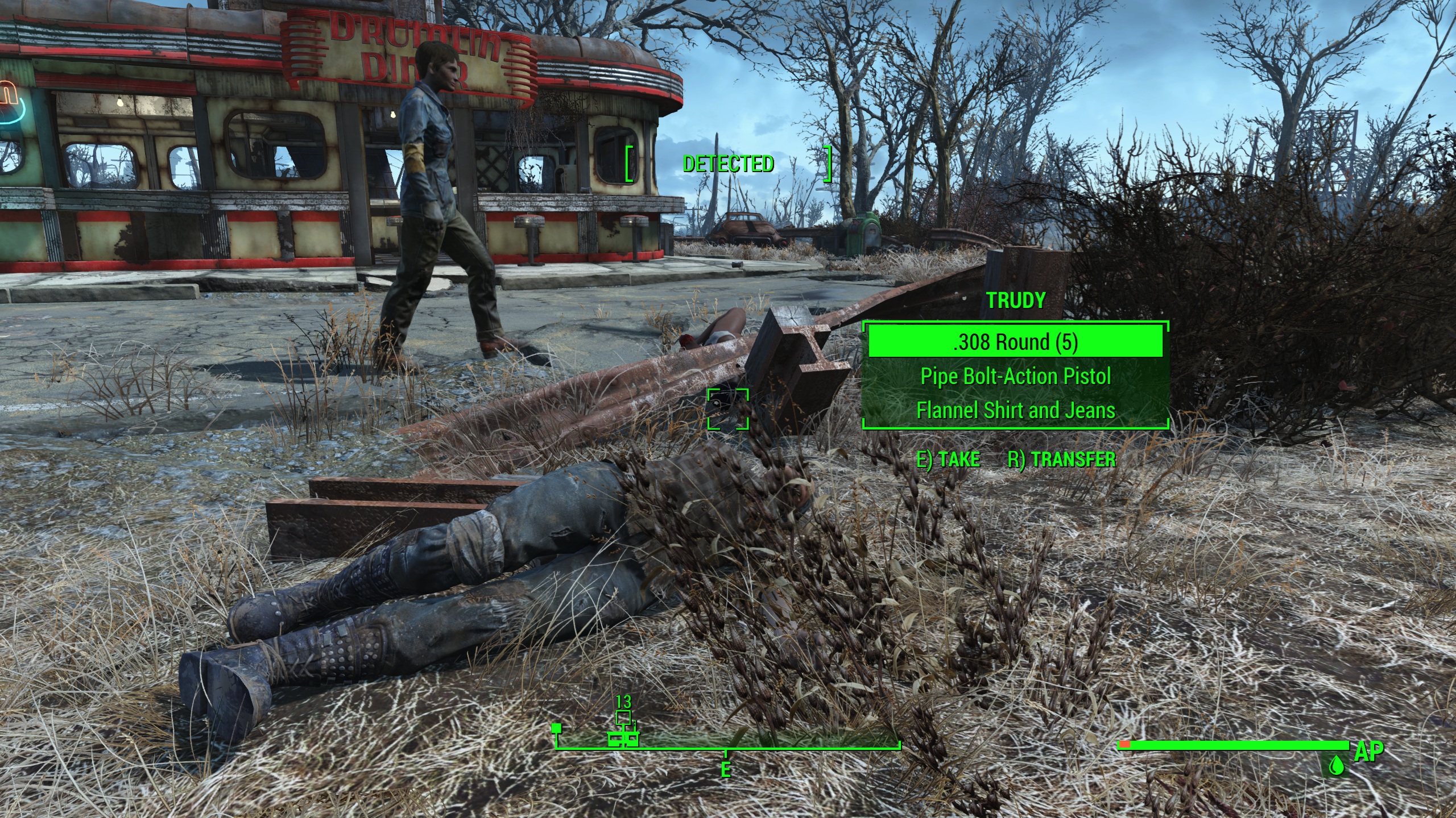 >hear pipe pistol fire near Drumlin Diner>think little of it, often Trudy and her son kill a small group of respawning raiders there>arrive>no raiders>Trashcan Carla killed them bothuhh