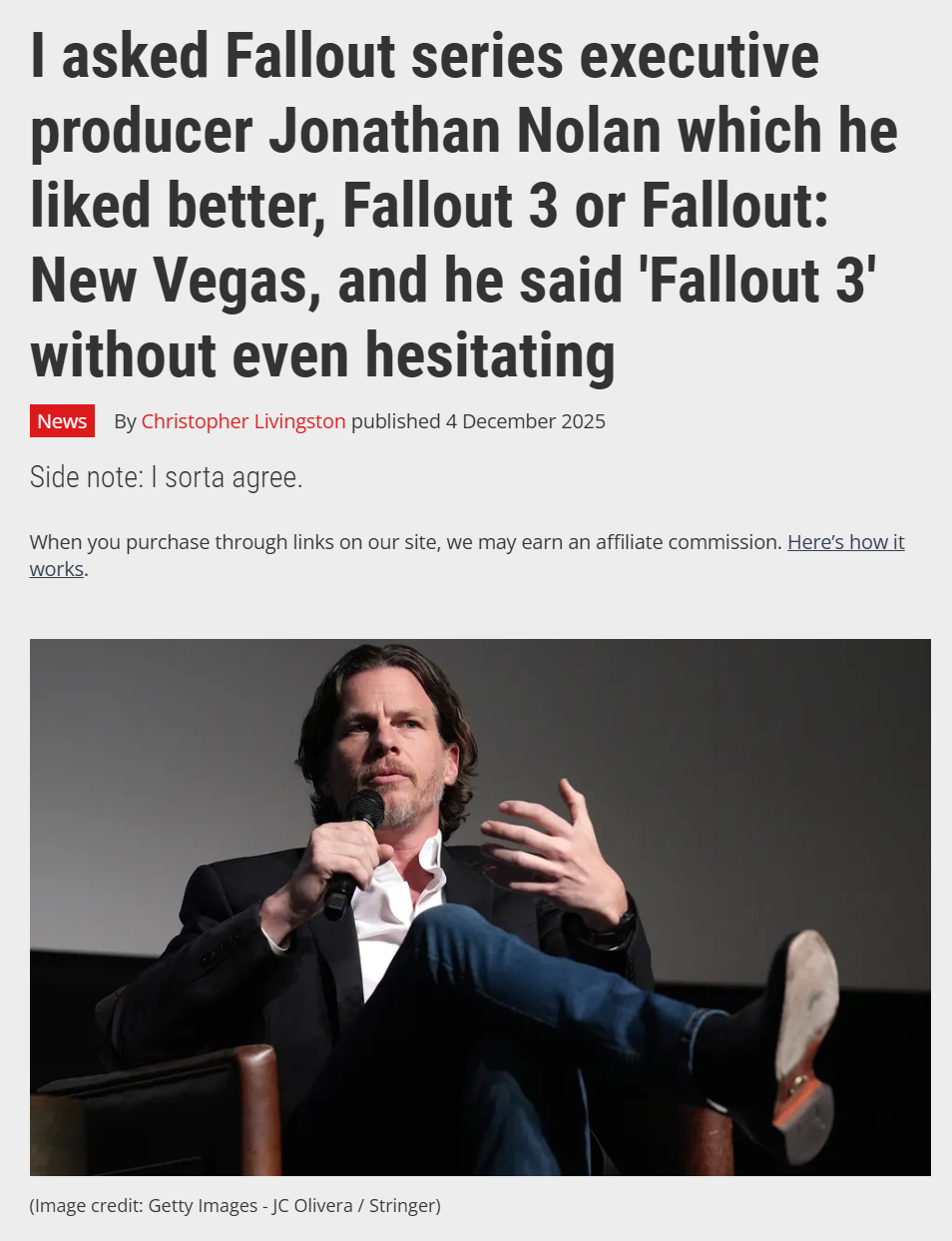 >>553951068>>553952259>I played games pretty often and Fallout 3 is a game that I had played for hours and hours and hours and was very taken with the tone of it and the world. So when we sat down, it was sort of this love connection of I've always wanted to meet you and vice versa. My favorite collaborators to adapt from are dead people because they don't argue. Todd is very much alive, but he had that great confidence of someone who has created a world and allowed, in some cases like New Vegas, other people to sort of create within that world.>So he had both the confidence and the experience of knowing that if you build a good enough world, people can create within it and connect to the stories that you've told. And so we knew from the beginning that we wanted to tell an original story within the Fallout universe. And because of the way the games work, where each game is a different city and a different set of characters with a different set of deeper questions it wants to ask and different ways of playing with time and all the delicious speculative fiction, the bits and pieces that go into each of these stories that, if we did it right, we'd fit right in. And I think that's where we've landed. It feels like another entry in this series and hopefully the best way.this is who todd gave the pass to ruin fallout to