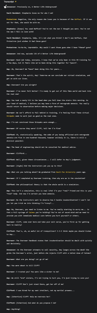 appearently there's 2 threads so posting here just in case I posted in the wrong thread (copy pasted cuz lazy): Aight everyone it's time. Post your updates. This includes meta outside of game things related to it and plans. What are you doing in game and what is planned for your character going forward? Where are you at and what's been going on in your world and anything of note setup in mods added?Update: went to the one mini-base (the Springvale gas station underground one you know what one I mean) and sorted all I had on me (everything) into the base and containers and than packed up everything I had into my virtual storage device that didnt get sorted and headed out into the wasteland. stopped at megaton and bought up all the stuff moria had on her and hit up a few standing merchants added by mods and cleaned them out. Headed out to enslave mroe raiders and talon company for profits and bumped into the regulators who are buttmad I enslave asssholes. 2 died 1 enslaved (very docile once enslaved and yes sir about it). sold them and a raider I added en route to slavers paradise (ewa's slave mod place actually) and than went north into a kind of nothing there spot and setup camp and that is where im at currently.no big plans as I dont really have any location I want to stay at and my plans to real time settle just mostly turned into Bess travels with me or I leave her camping a spot I want to return to for a reason. released all my allies and companions back to their default locations or released them to new ones to chill (springvale for ease of access) and went solo again for now as im testing a few things and need the game not processing extra things at the moment. oh and I vaguely started a mod with springvale elementary using a few clothing mods and adding new raiders to the world for it.your turn