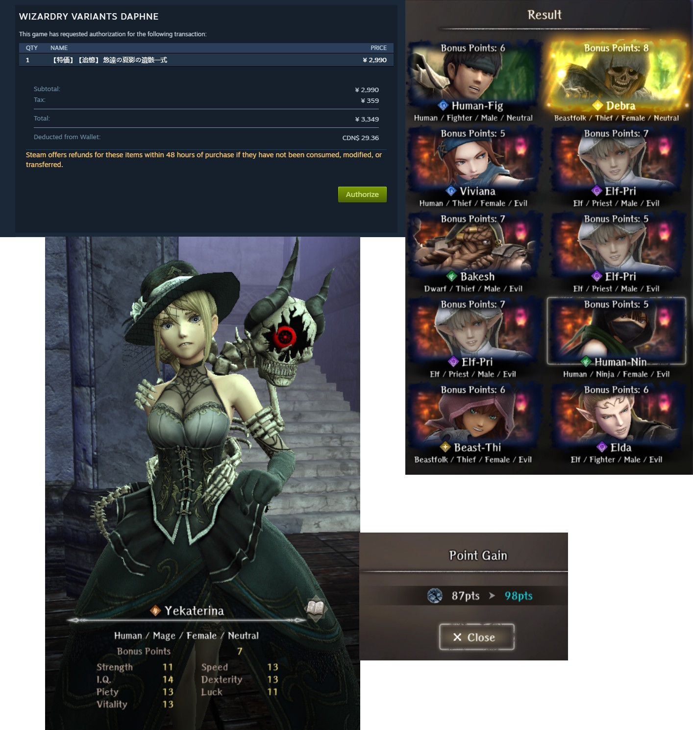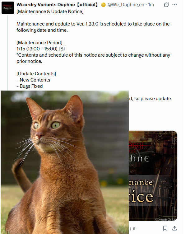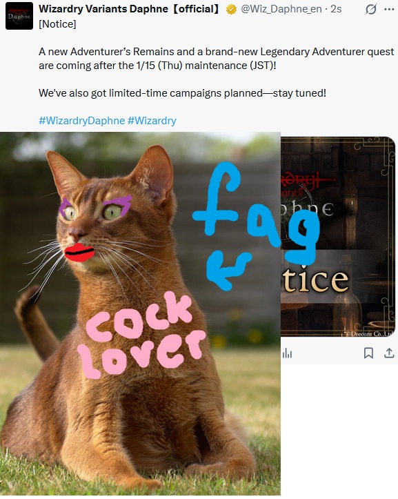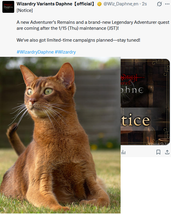 Lonely swordsman women edition>Current Featured Adventurer Banners:Snow-Sleeved Maiden, Alice - Until 1/27Hunter Who Reads the Woods, Yrsa - Until 1/21>Current Reminiscence Adventurer Banners:Ardent Kingslayer Galbadus - Until 1/14Summer Yeka and Summer Chloe - Until 2/3>Wizardry Variants is available on Android and Steam:https://store.steampowered.com/app/2379740/Wizardry_Variants_Daphne/https://play.google.com/store/apps/details?id=jp.co.drecom.wizardry.daphne>Current Events/New Content:[Free Gems] 200 gem code in webstore - YJseQZA8dJ[New Abyss] Deepsnow Hinterlands[New Quest] Alabaster Wolf Pelt[Mission pass: Yrsa banner][Mission pass: Ossuary]FREE 800 Gems of Org (one time) + 50 per week on their official web currency store: store.wizardry.info[Japanese VPN only] ANOTHER FREE 800 Gems of Org (one time) + 50 per week: webstore.wizardry.info/product>Fanguides:https://wizardry.fasterthoughts.io/ - (EN)https://gamerch.com/wizardry-daphne/ - (JP)>General Information:https://rentry.org/x5xxitrz>Tavern/Camp choices:https://rentry.org/2gngvv2n>Friend Code:https://rentry.org/SavoryRisk>I.V checker and Other Stat Calculators:https://wizardry-daphne.mcwild.net/init_status/>In-depth Gacha Rates (ja/ko only)https://wizardry.info/daphne/gacha_rates/ja/characters.htmlhttps://wizardry.info/daphne/gacha_rates/ja/equipments.htmlPrevious thread:>>>553341121