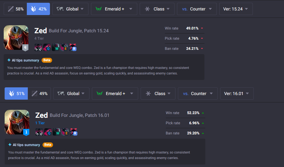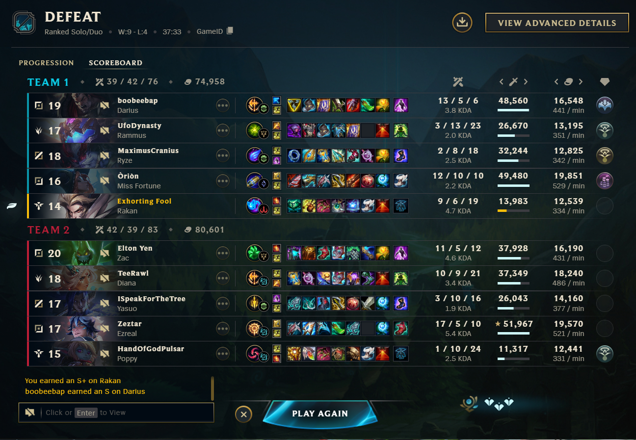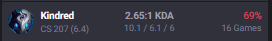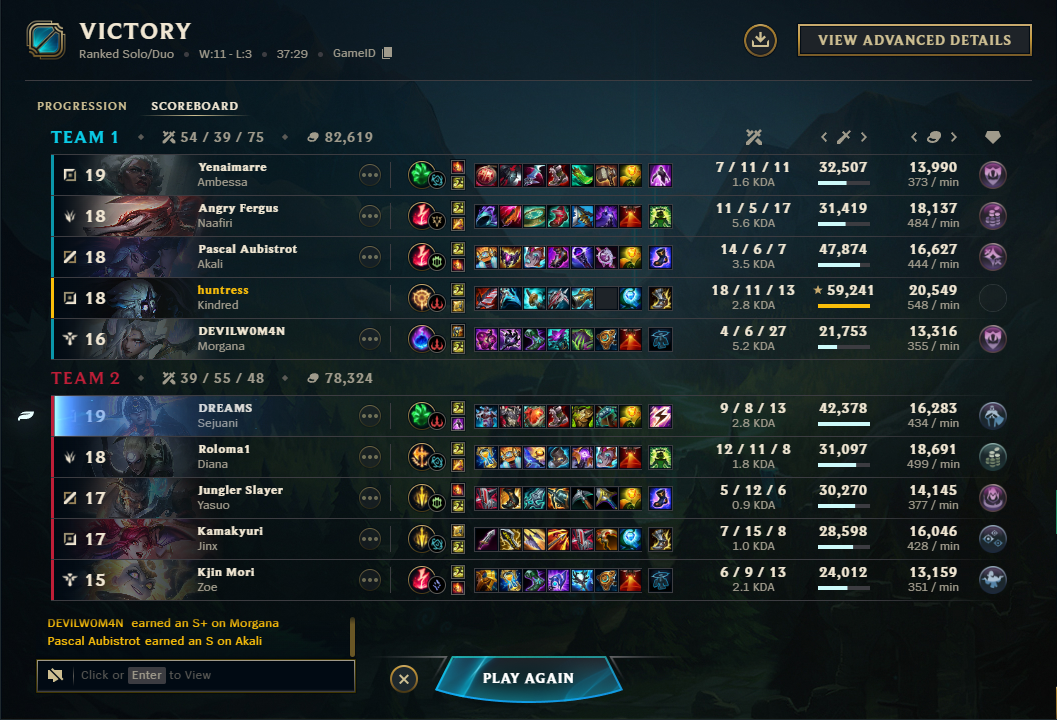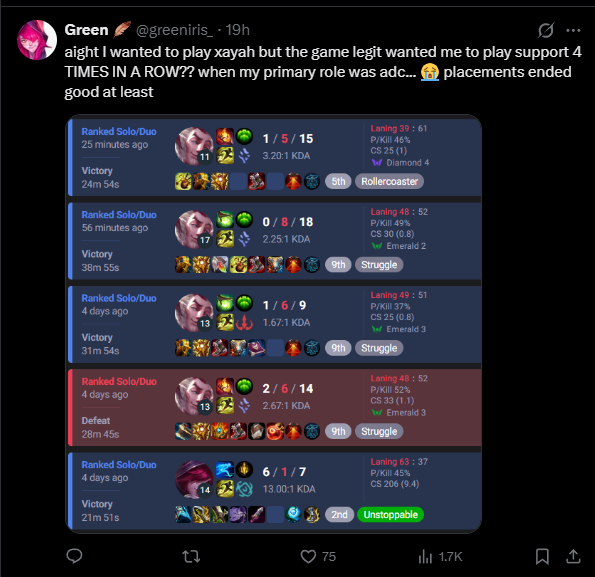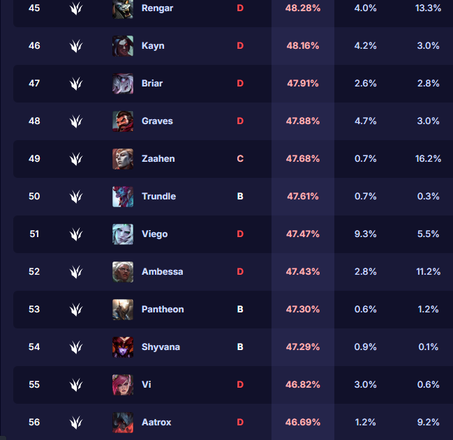 >last 20 games>50% win rate>it evened out at the 30 games threshold>still +27 -13Infuriating, still awful I play with the team and get nothing for it. Roam to help someone, if they get a lead they throw it, otherwise it's a Double because they fed early.