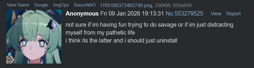 >>553634583Not having a static and trying week 1 pf savage made me realize I don't know why I'm playing this game anymore.Raiding is only fun with friends (that I don't have anymore) but I don't know where else to go.