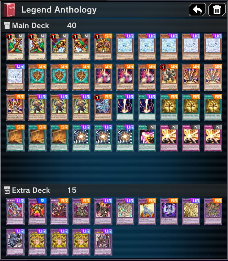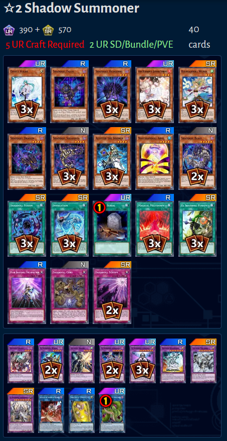 >>553649559I've been playing this. It's unoptimized because I don't want to invest into such a bad deck, but considering the archetype just has 1 UR itself I'm willing to give it a try.The idea is>the deck is badSo we're greedy and running solemns to make sure you at least win going first.>ending on just the fusion is badSo search Salamandra with chain since non-target book of moon+followup GY fusion effect is better than just ending on a targeted pop.>the archetype has two book of moon effectsSo run Soul of the Supreme King to un-negate him and turn him into a board clear.I think I would max out on Trapholic if I had more, and same for Soul of the Supreme King+Daruma, but again I don't want to invest more UR into it. I'm undecided on whether a second Songs for Trap Trick is worth it or whether it should just be cut.
