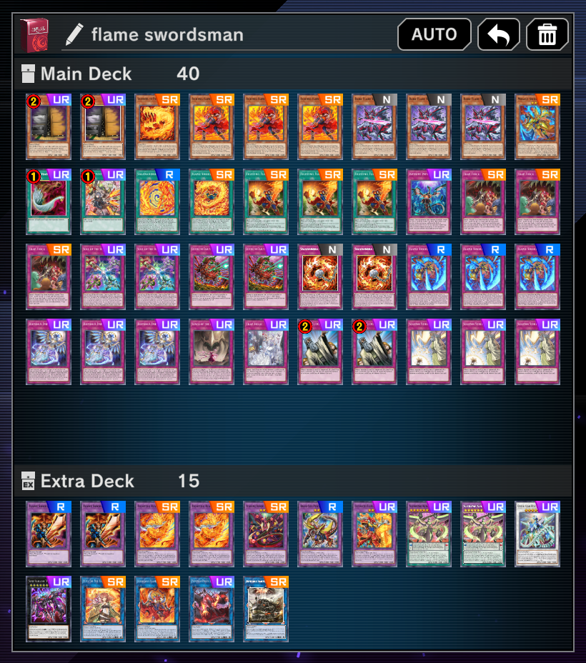 The new Flame Swordsman card is really nice. The deck's still bad but it helps a decent bit. Doesn't fix that it still has the whole Shining Sarc issue where it just doesn't have a good enough endboard, but at least it doesn't have to run as many bricky cards as Sarc does and it seems to has an easier time OTKing on turn 3 after you've shut down their turn.I've been using the Zarc trap gimmick and Trapholic is really useful for that. It also helps put your Salamandra with Chain in the GY earlier so you can use its fusion effect on their turn if you have to.