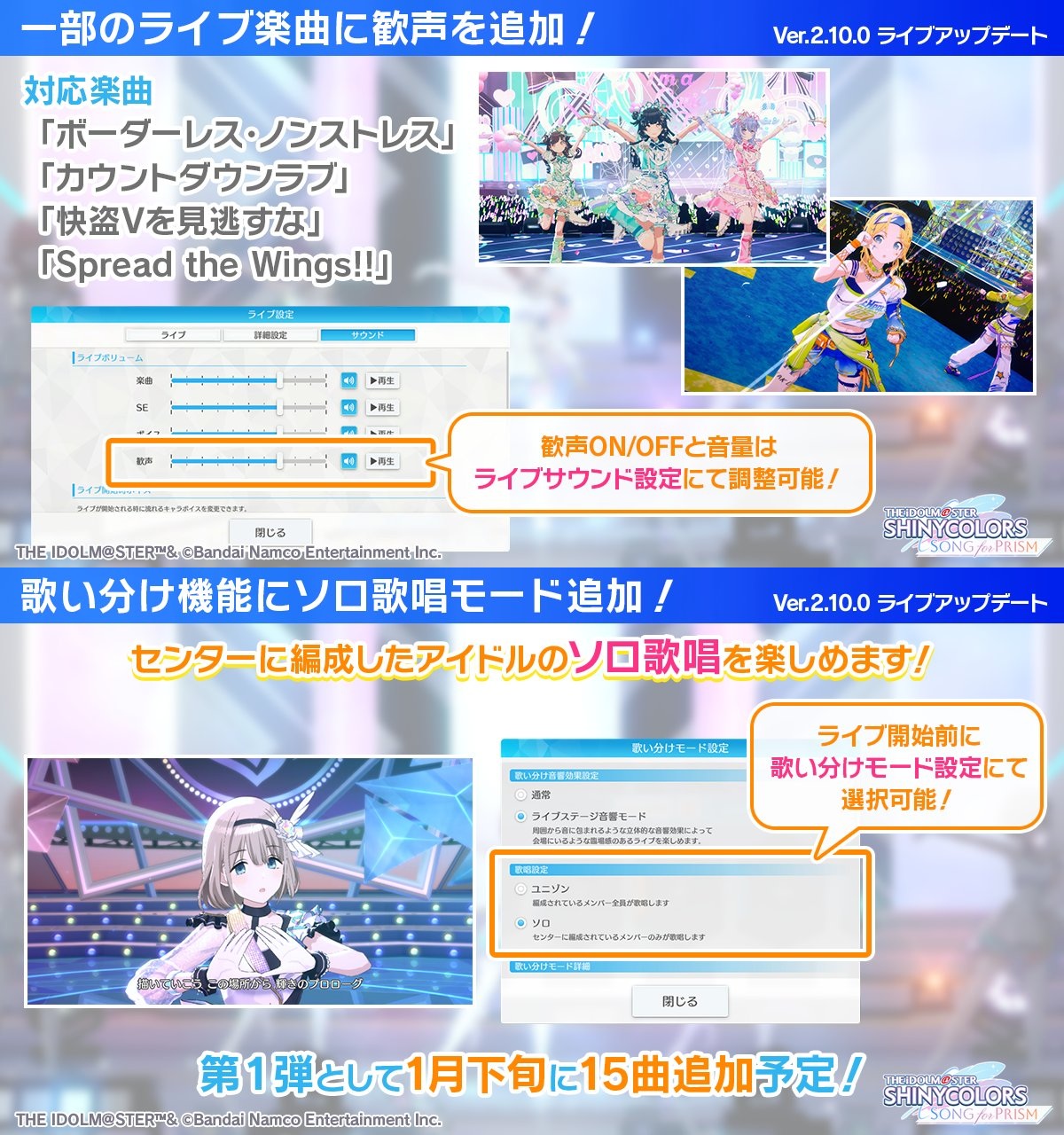 SfP Ver.2.10.0 is on the way. Update features will include things such as...- Adding cheers to certain songshttps://twitter.com/imassc_prism/status/2010924769256812692?s=20- Adding center solo singing options for certain songshttps://twitter.com/imassc_prism/status/2010925018436530441?s=20