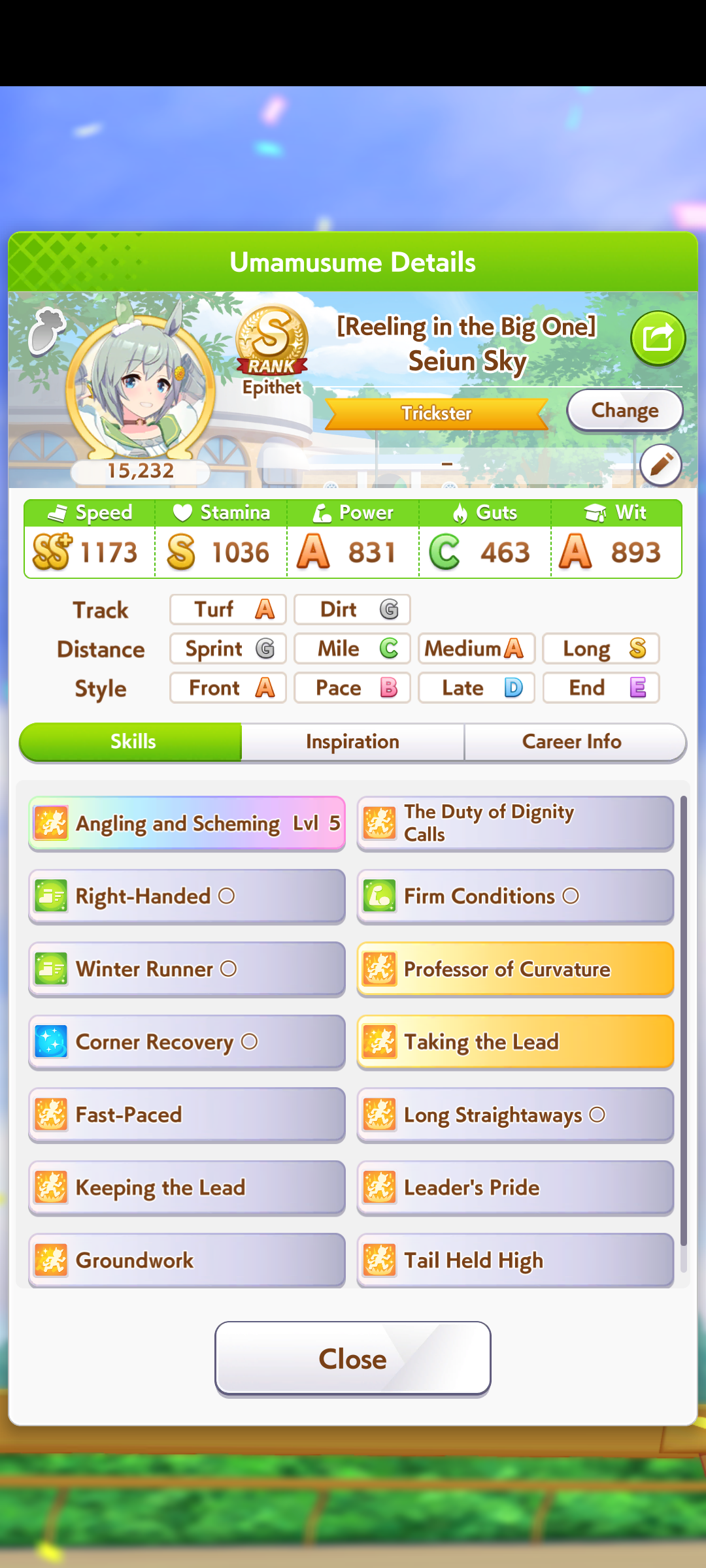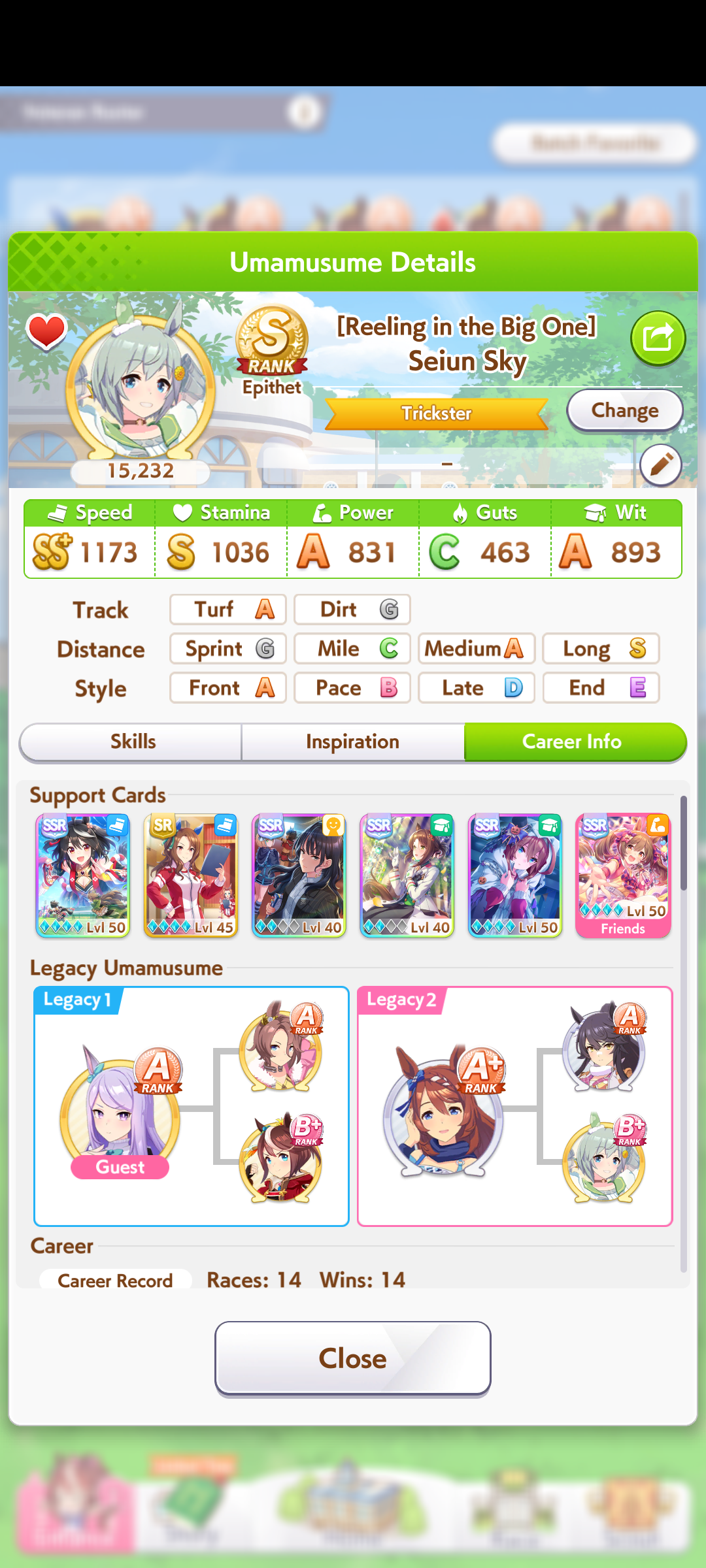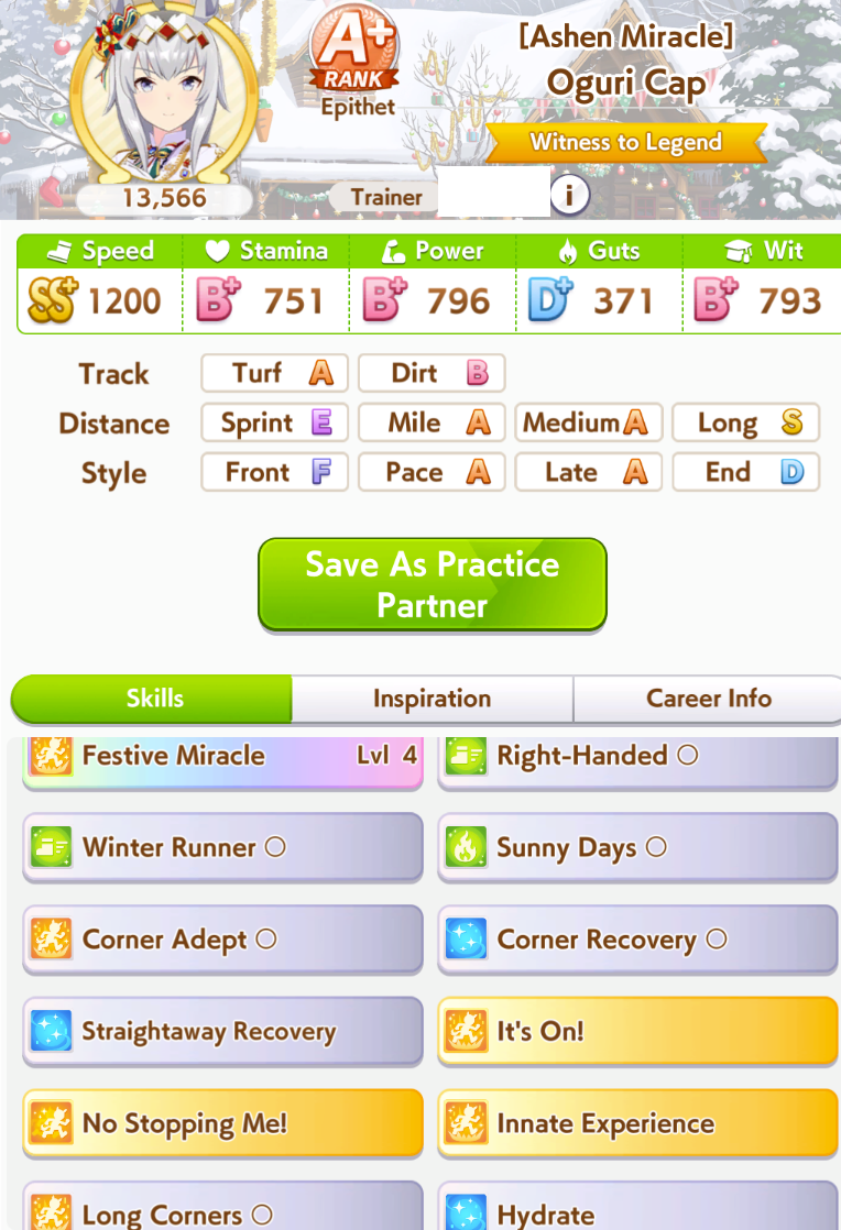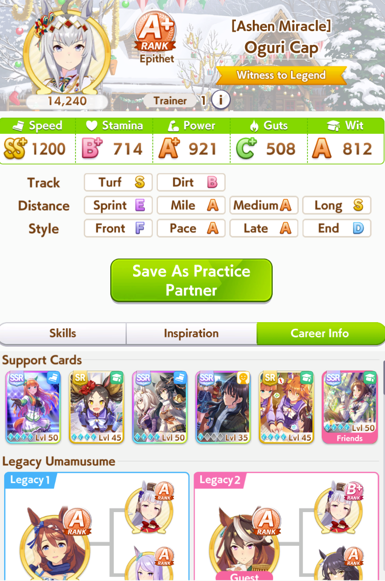 No long S but I think this is as good a Cafe as I can make.After like 40+ glue runs finally something semi-usable.It gets demolished by XOguri and a good Golshi (no umastan so forever last place) or Taishin from what I noticed in practice rooms but I am assuming the tryhards in the practice rooms are a minority of players right? Please say yes