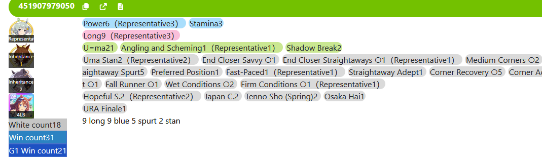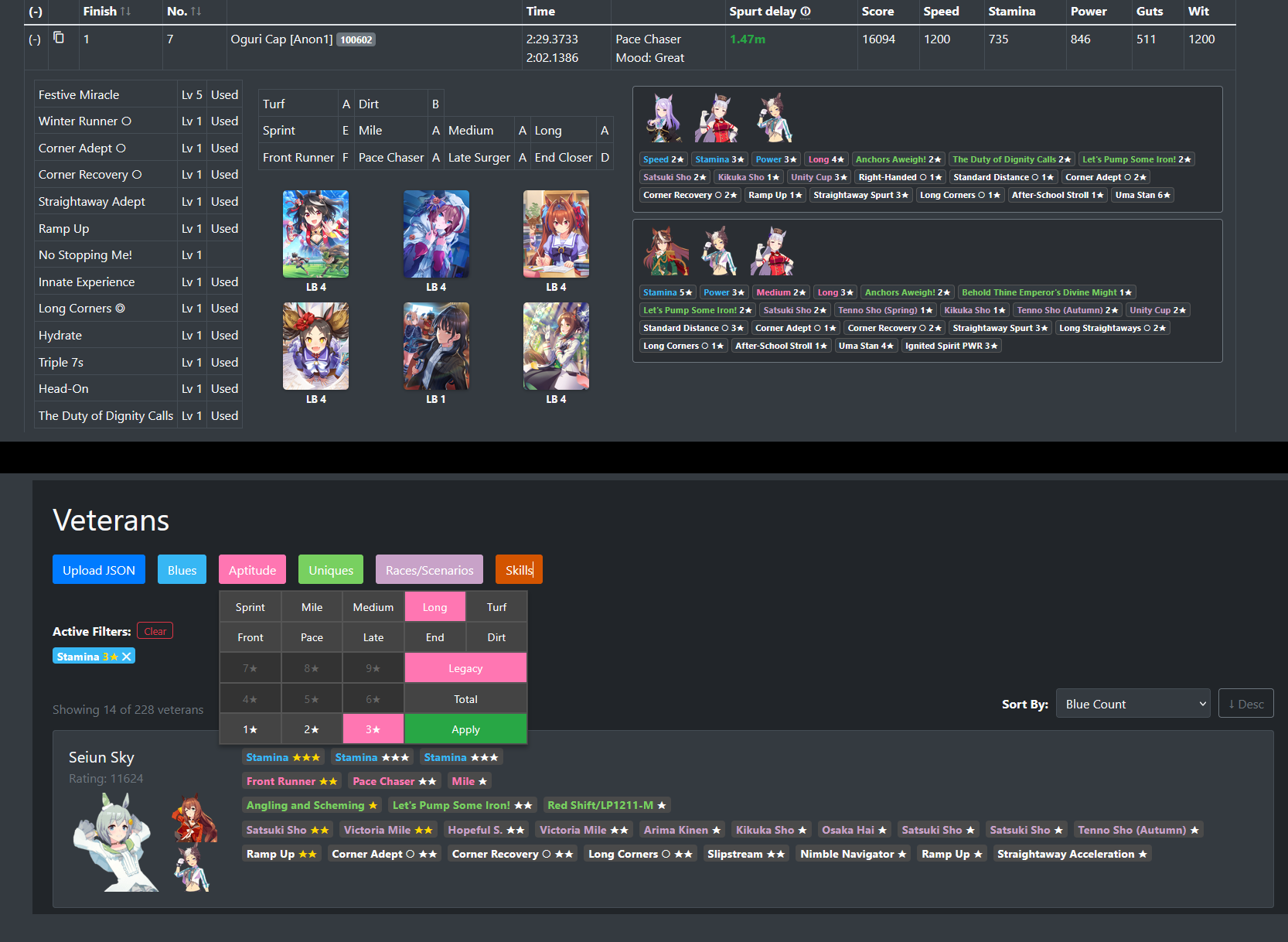 >>553652192Just deployed a bunch of changes, so enjoy. Most notably, the new version of horseACT (the race dumping plugin) is now open source so you can verify I am not mining umacoin on your computer. It now directly dumps the whole RaceInfo object from the game instead of reading network data, which lets us access some neat extra information to display, some of which I've already added. You now get deck lists and information about the parents used for each uma in the race (as seen at the top of the image in >>553651987) and I've added a new page for filtering your veteran umas for specific spark combinations.