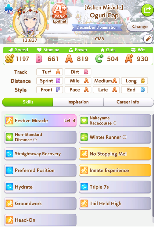 This dumb fucking build I did as practice is outperforming my actual Christmas Oguri by a 5-2 ratio.
