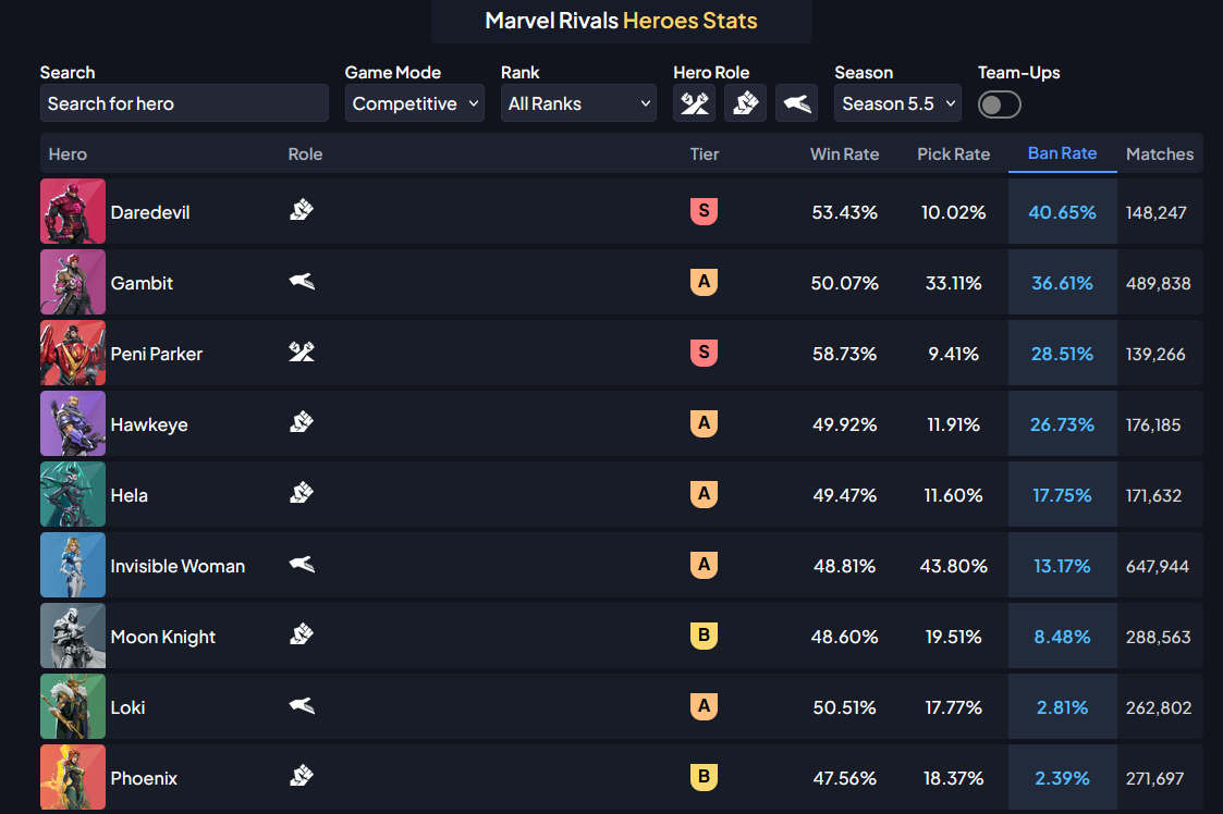 Hero Hot List: https://marvelrivals.com/heroes_data/