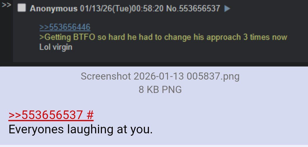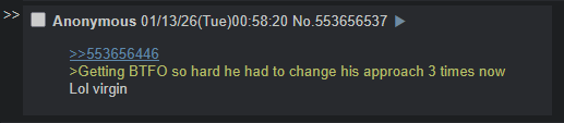 >>553656446>Getting BTFO so hard he had to change his approach 3 times nowLol virgin