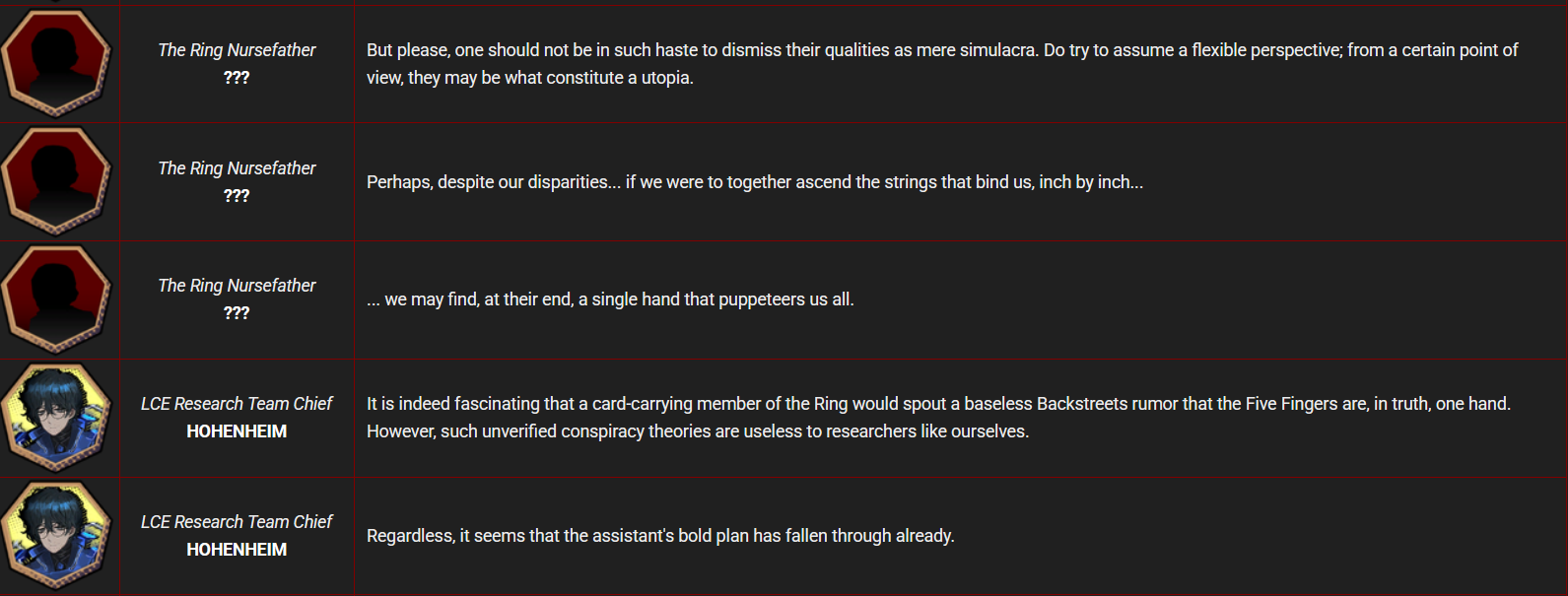 So, here's predictions for the rest of the IDs, if we do get the Nursefathers and Outis is out because she shares the same mirror world:Valencina - Rodya (no one left fit her)Rien - Yi Sang (basically confirmed from Don story)Matthias - Can be either Heath or GregorRing Nursefather - Probably Meursault?Shiomi - Ryoshu, unless she got an original IDLucio - Either Hong Lu or Gregor,Albina - FaustRen - Either Hong Lu or Sinclair, probably the latter