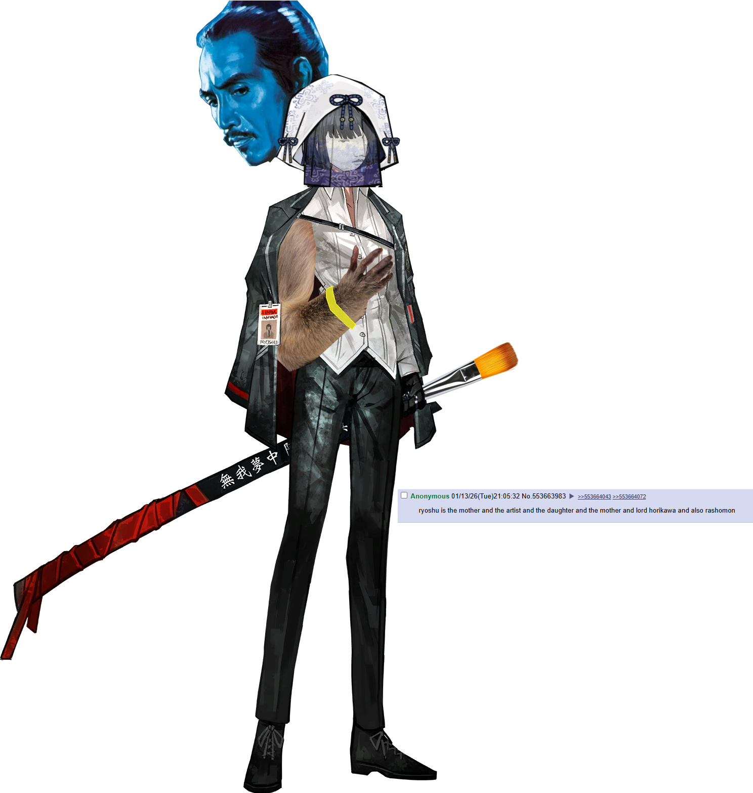 >>553661513NTA but I see the timeline where the ID storywise is the bad ending fully trained memory shattered violent asura ryoshu BUT the outfit is just that pinky bitches, the same way hong lus wasn't LITERALLY jia qiu but the outfit was