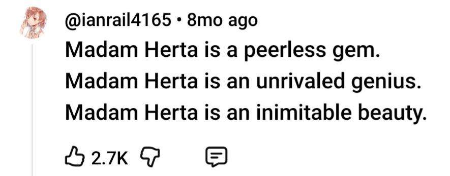 >>553681915Reflecting in silence about being saved by the beautiful and cute madam Herta FOUR times already