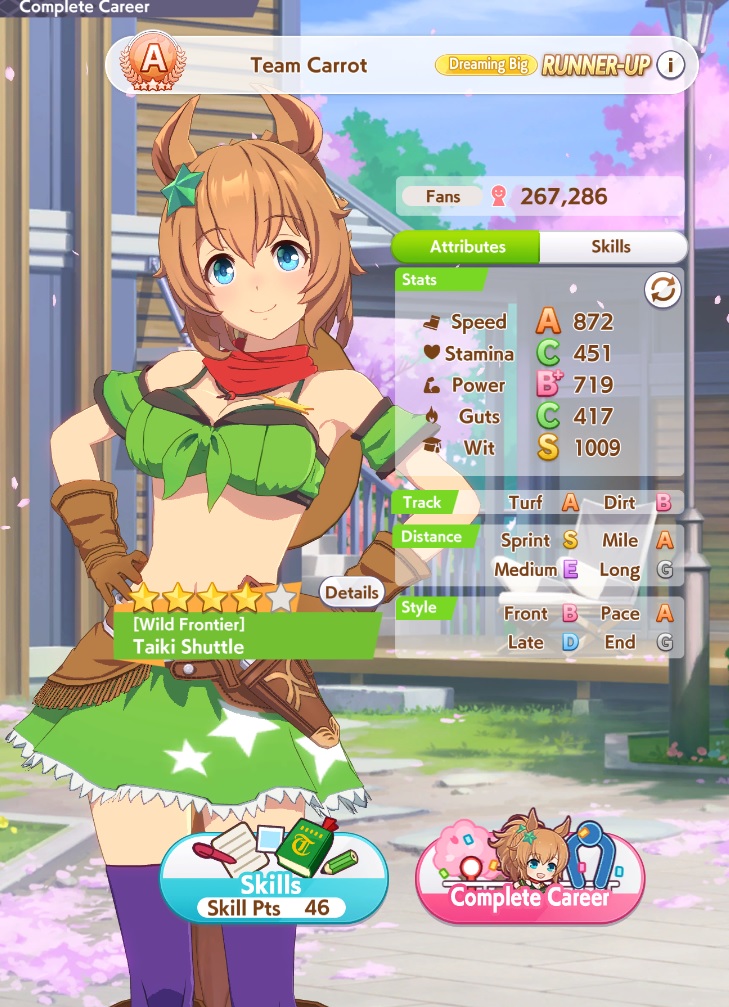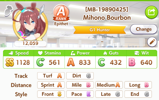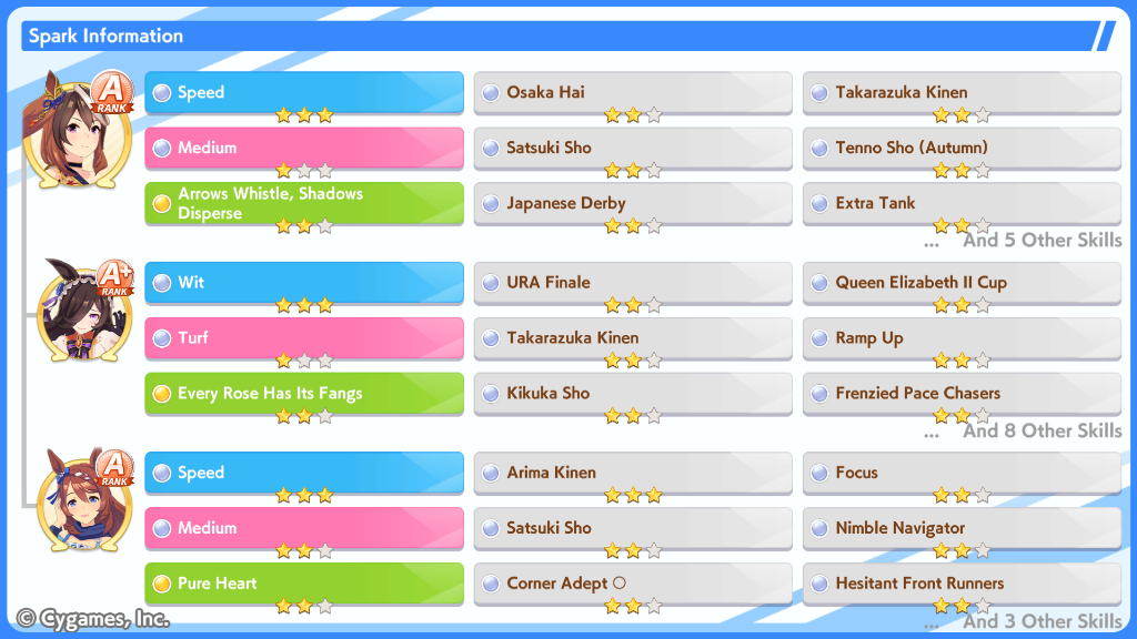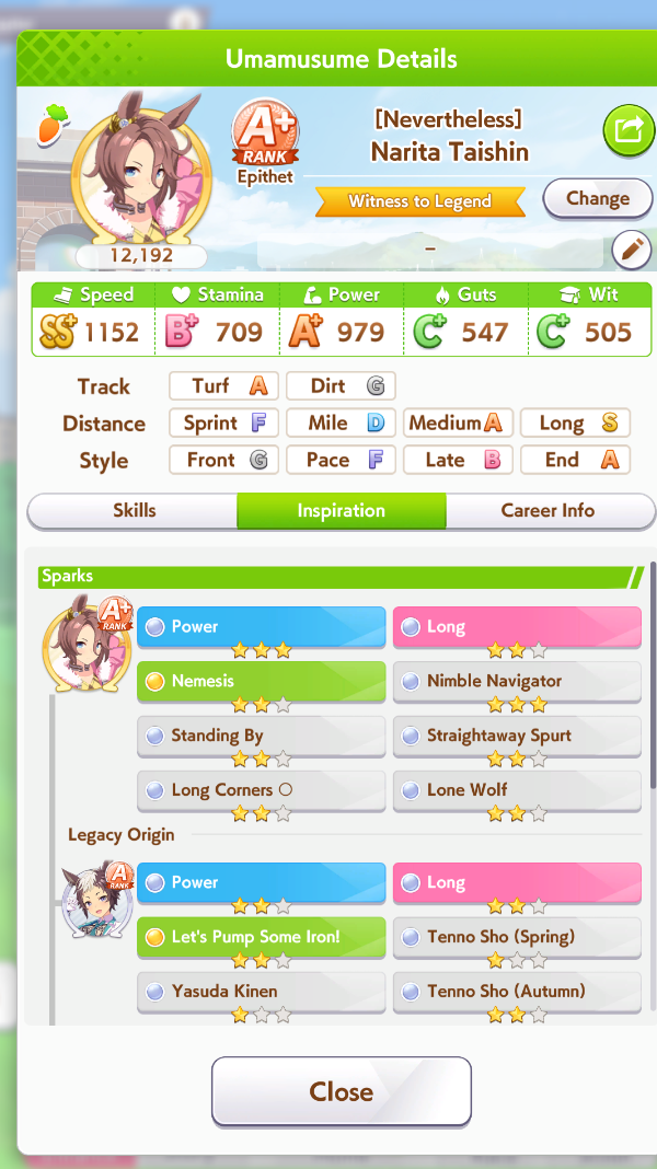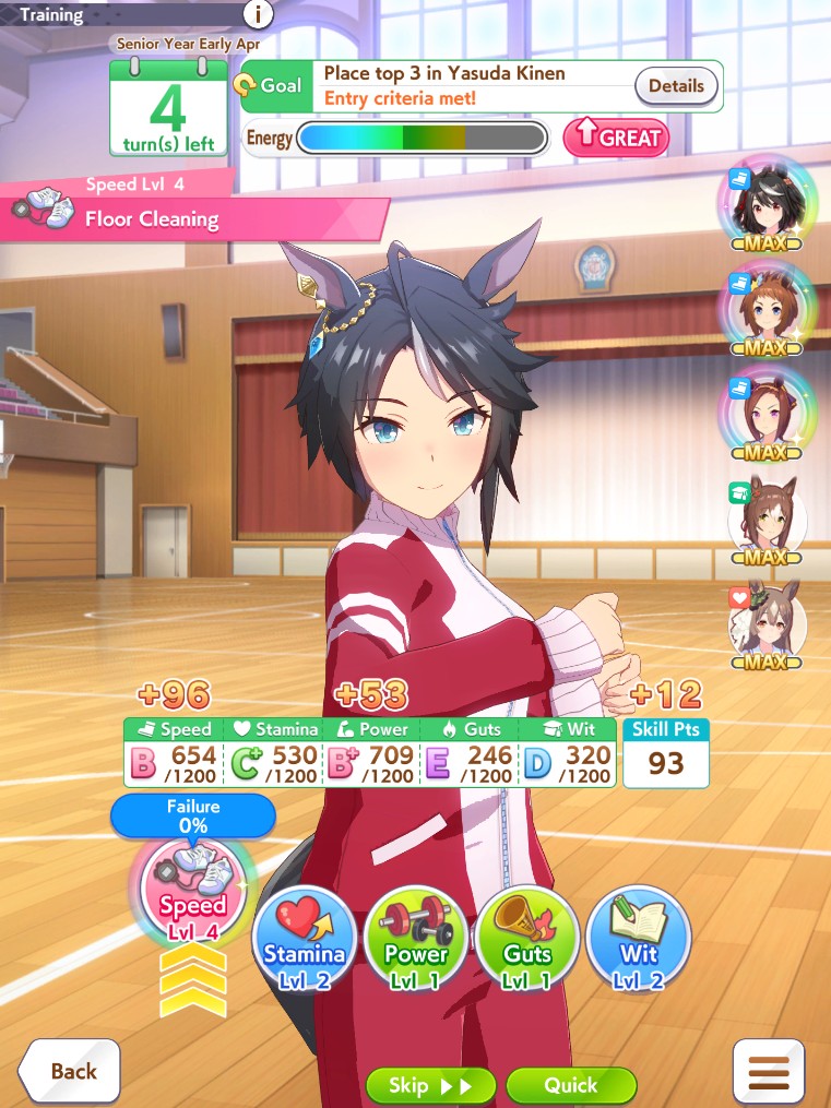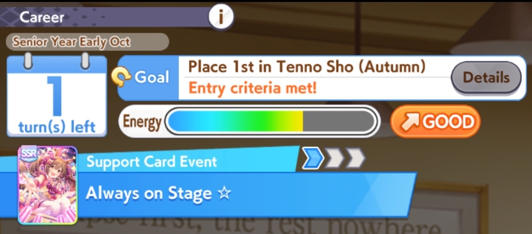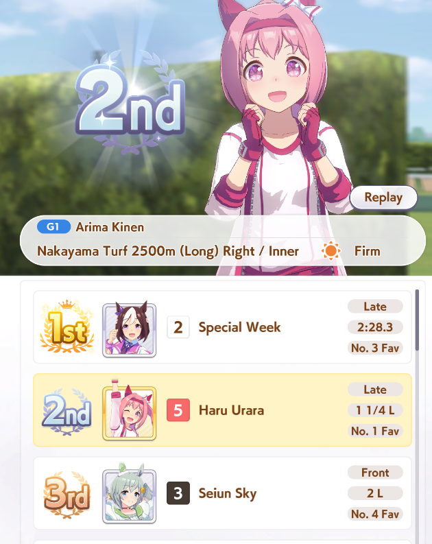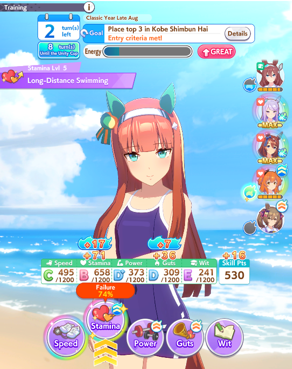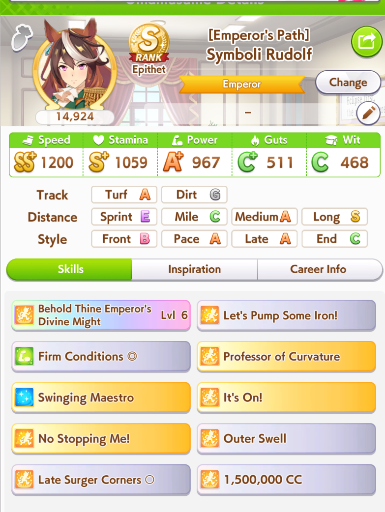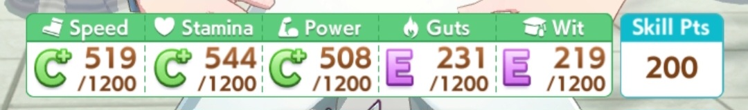 Still need ~350 stam before Kikuka Sho, maybe around ~450 just to survive the Akiten and Arima Kinen. Failed Sprinter Stakes Classic and Takatsunomiya Kinen though so it's a brick. Wit 2* also hurts