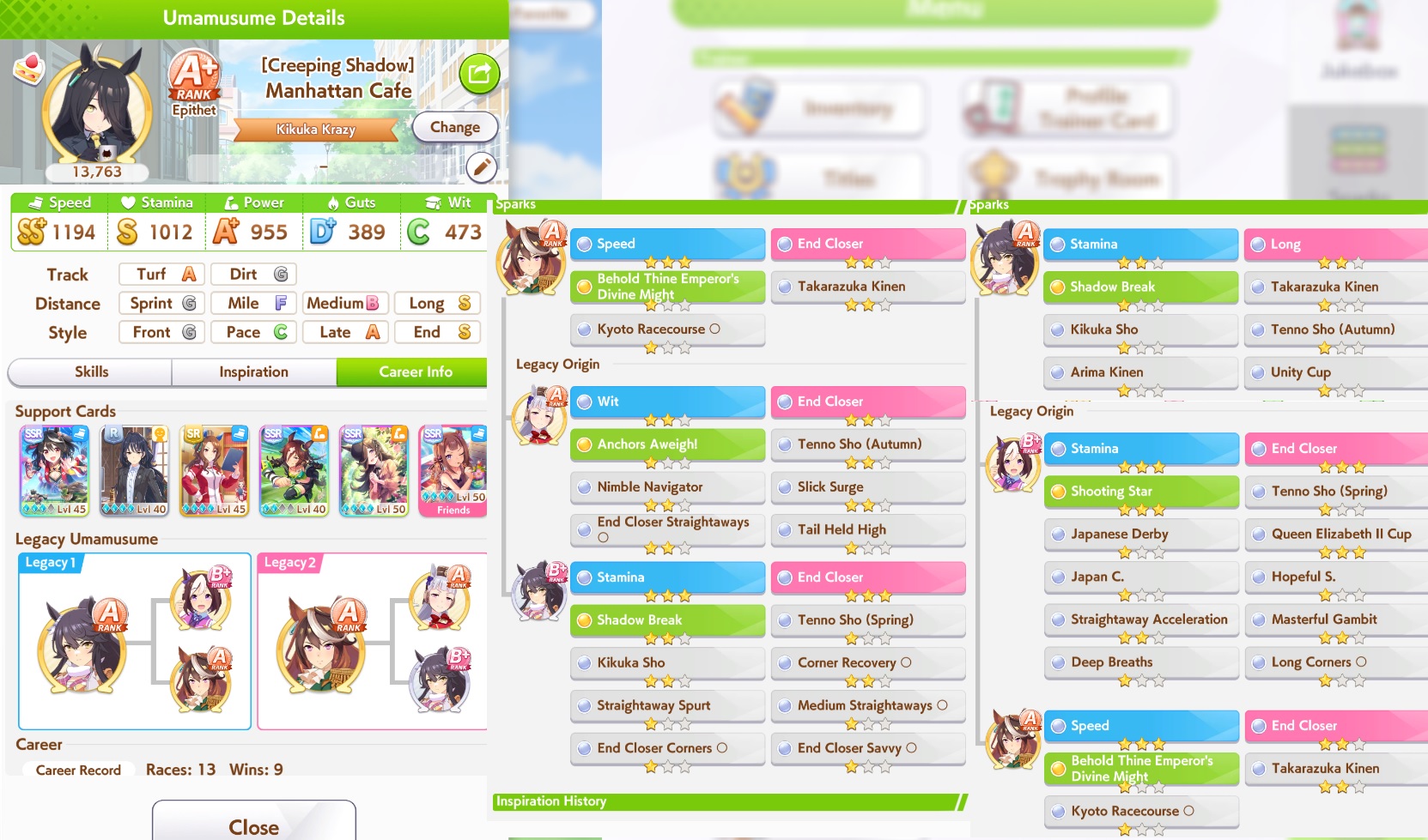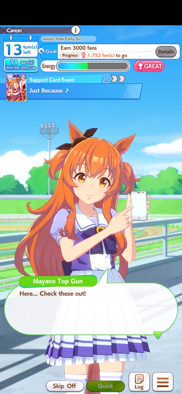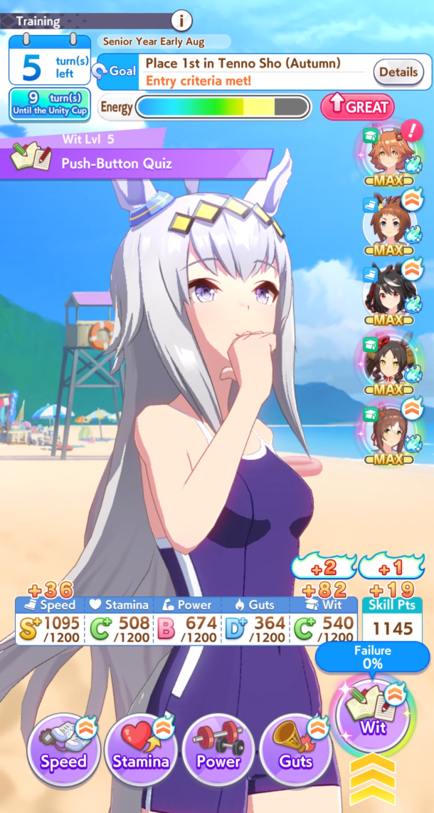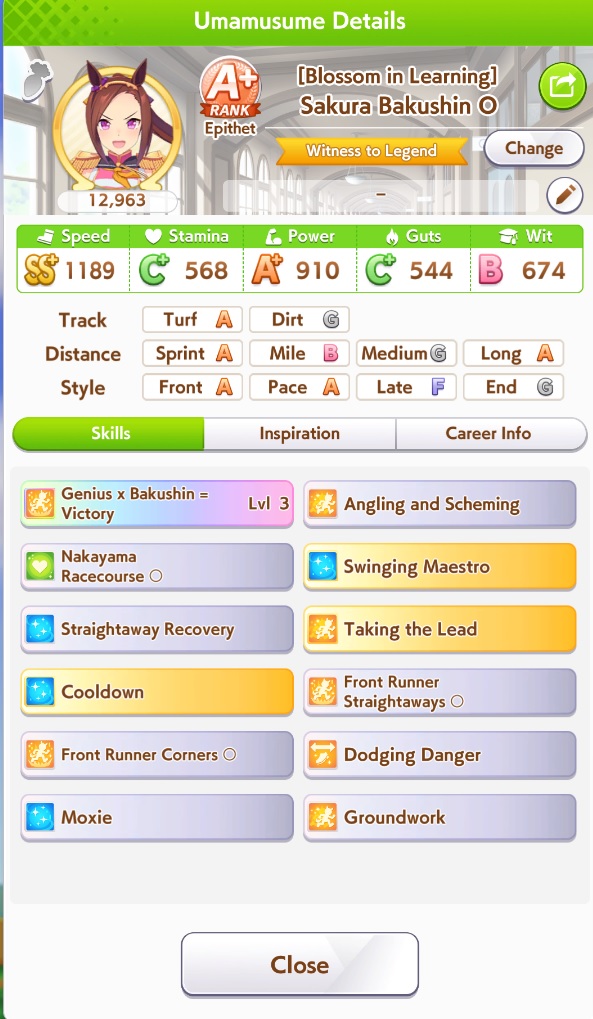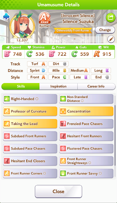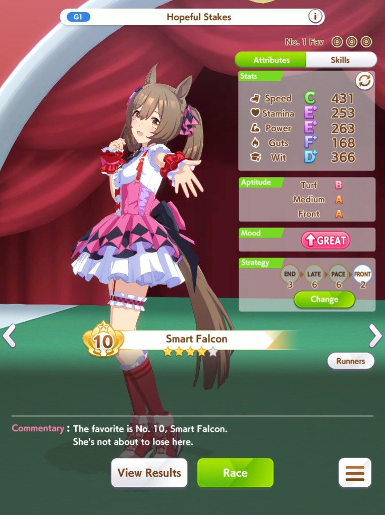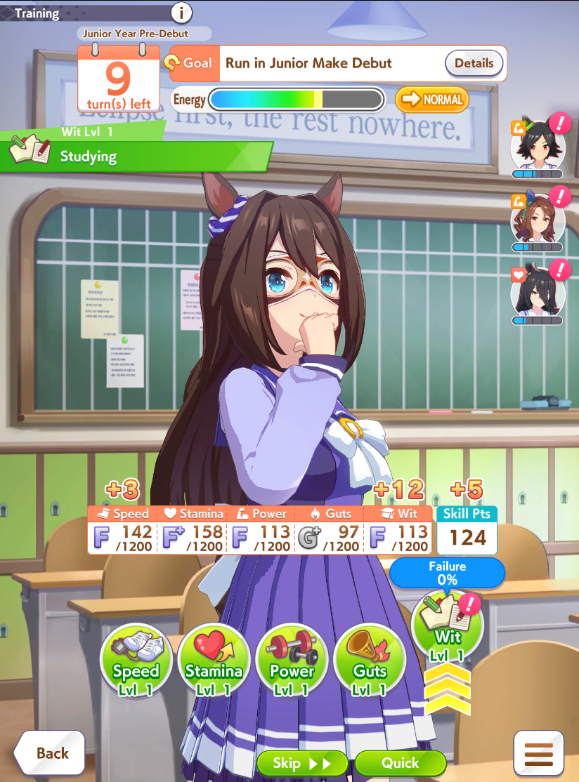 Still need ~350 stam before Kikuka Sho, maybe around ~450 just to survive the Akiten and Arima Kinen. Failed Sprinter Stakes Classic and Takatsunomiya Kinen though so it's a brick. Wit 2* also hurts