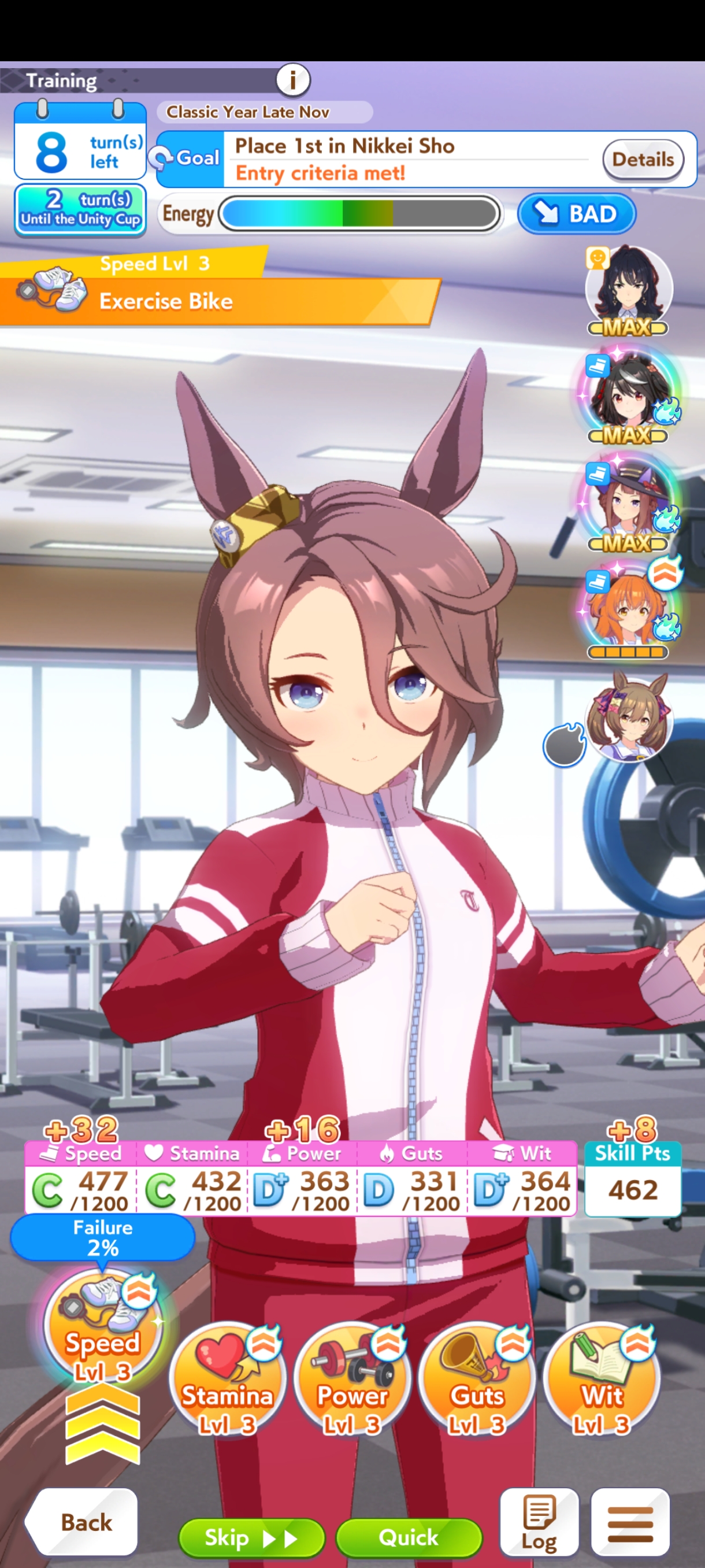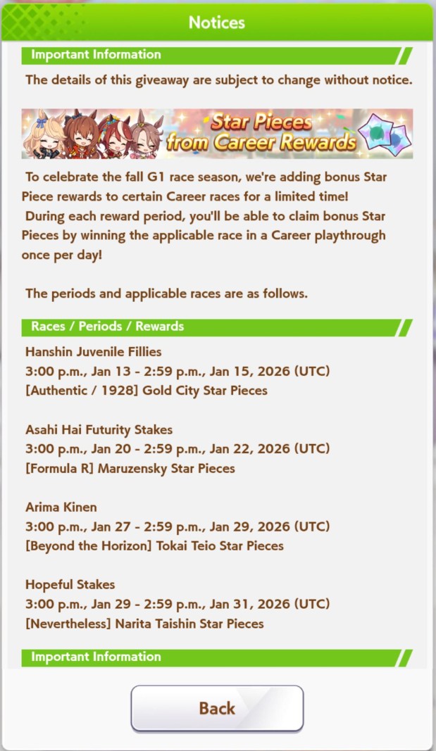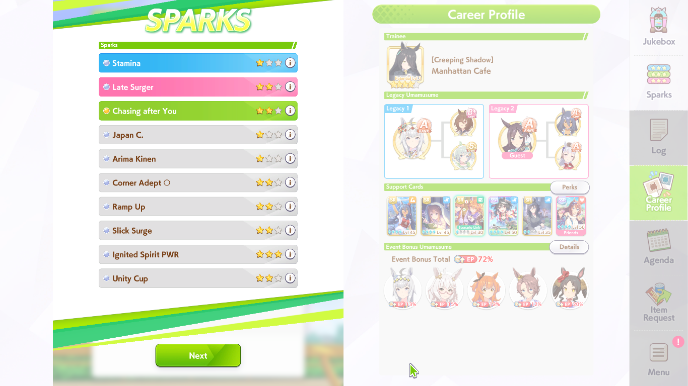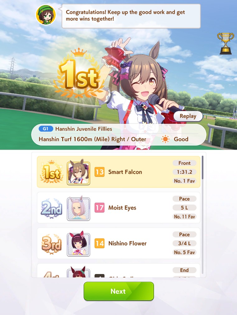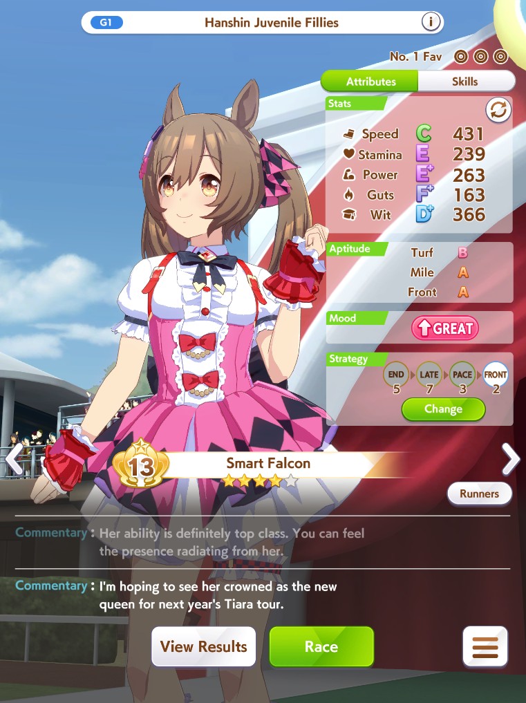 Still need ~350 stam before Kikuka Sho, maybe around ~450 just to survive the Akiten and Arima Kinen. Failed Sprinter Stakes Classic and Takatsunomiya Kinen though so it's a brick. Wit 2* also hurts