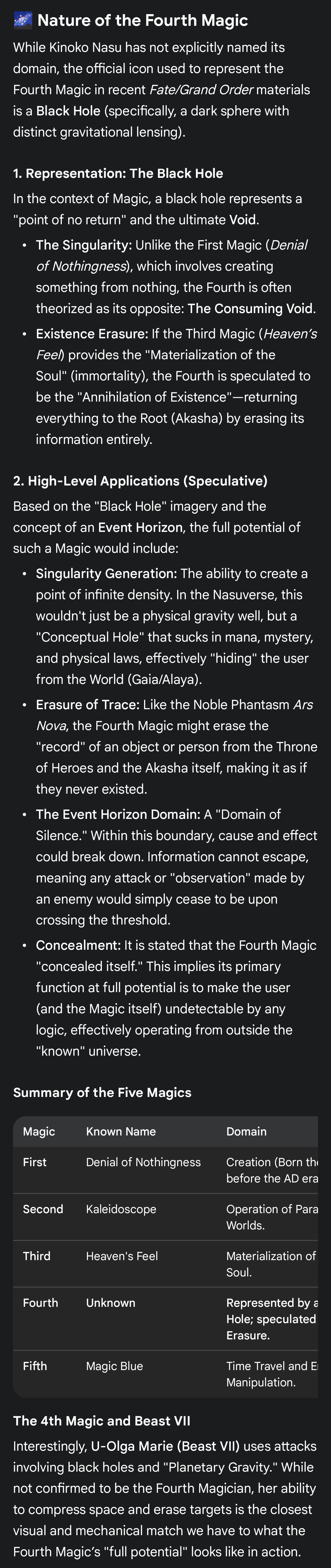 >>553826424>>553789808Olga's fucked if she goes back to PHH with her background. She'll be orphaned at 11 when Marisbilly dies. And, unlike Case Files, she didn't have Trisha, and was isolated by Marisbilly's upbringing. The other Lords will eat her alive. Unironically Marisbilly ignoring her as a toddler was better for her.Olga becoming a Grand Servant like Hassan and Merlin (Unbeast) is kind of a better ending for her, and she'll do the things she actually likes.