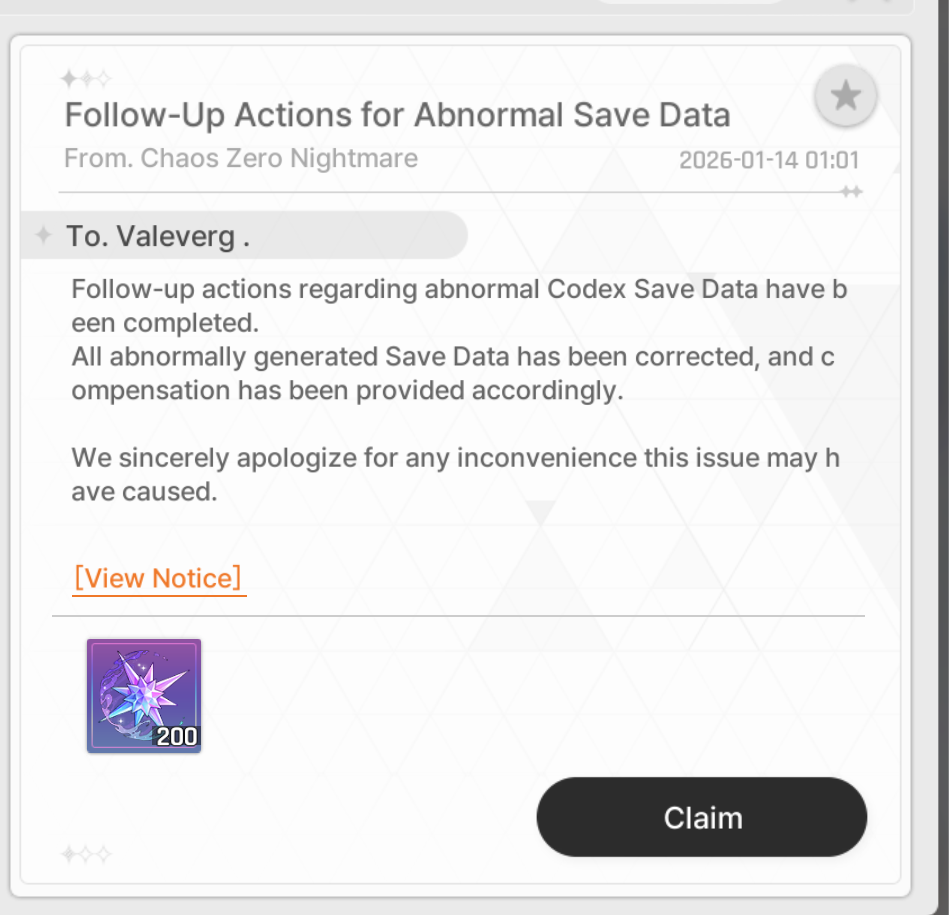 The Nightmare is Ongoing... >>553662676>Narja (NEW) Character PVhttps://www.youtube.com/watch?v=gjVsoW4BafI>Roadmap Streamhttps://www.youtube.com/watch?v=FsCuVfILlh4>Dev notes 01/13https://page.onstove.com/chaoszeronightmare/en/view/11778007>[Chaos Zero Nightmare] Galactic News Network: LIVEhttps://www.youtube.com/watch?v=0ZGrP9nBvwo>Useful Links and Resourceshttps://rentry.org/xtb66f3ihttps://wiki.e7bot.top/#/czn/combatant>Current Featured Banner[ Narja ] Instinct - ControllerRate Up Period: 01/14/2026 – 02/04/2026>Upcoming Featured BannersNine | Starts Feb4Tiphera | Starts Feb25>Current/Upcoming EventsNew Content – Spiral Tower of Screams (Beta)>Why didn't my Save Data save properly?Check the Rentryhttps://czn-calc.vercel.app/https://euri412.itch.io/save-data-calculatorhttps://czn-save-cal.web.app/