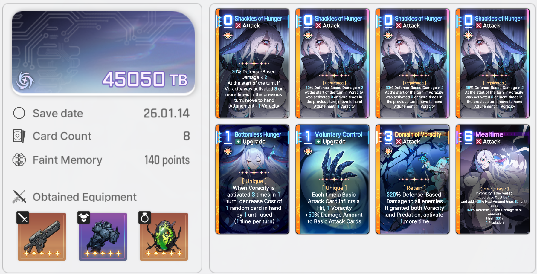 >>553799892Voluntary 2 is usually awkward in practice. You don't have enough voracity to play Mealtime so you end up with both sitting dead in your hand.