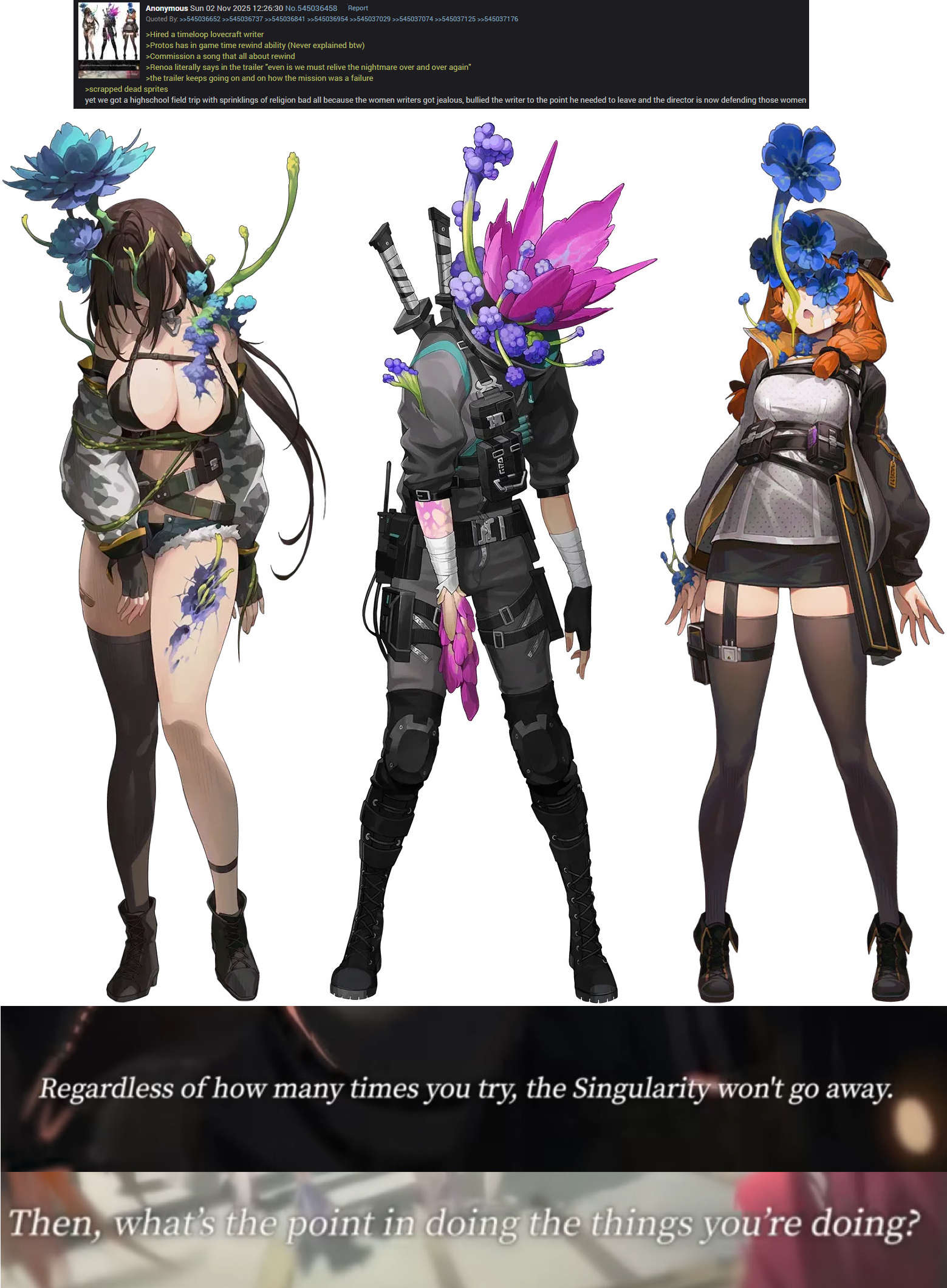 >>553791546>5 units in a row with tits the size of the earthPoster has a point. Devs no longer know how to design a character so the goon is all that's left. No one will care how a character look if the tits are massive and skin is showing.