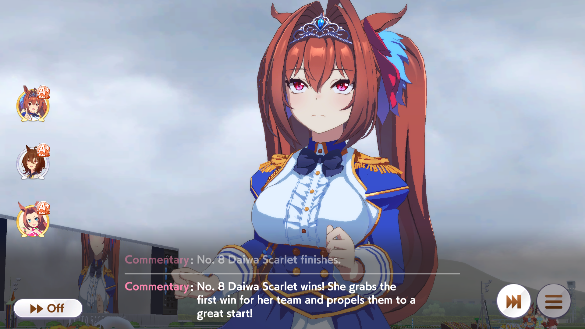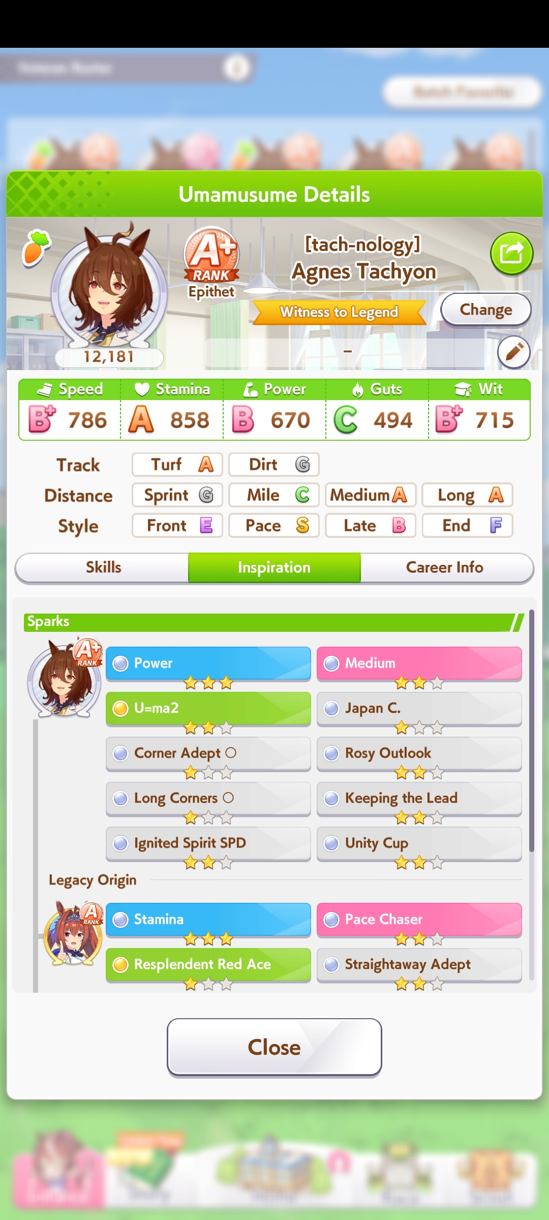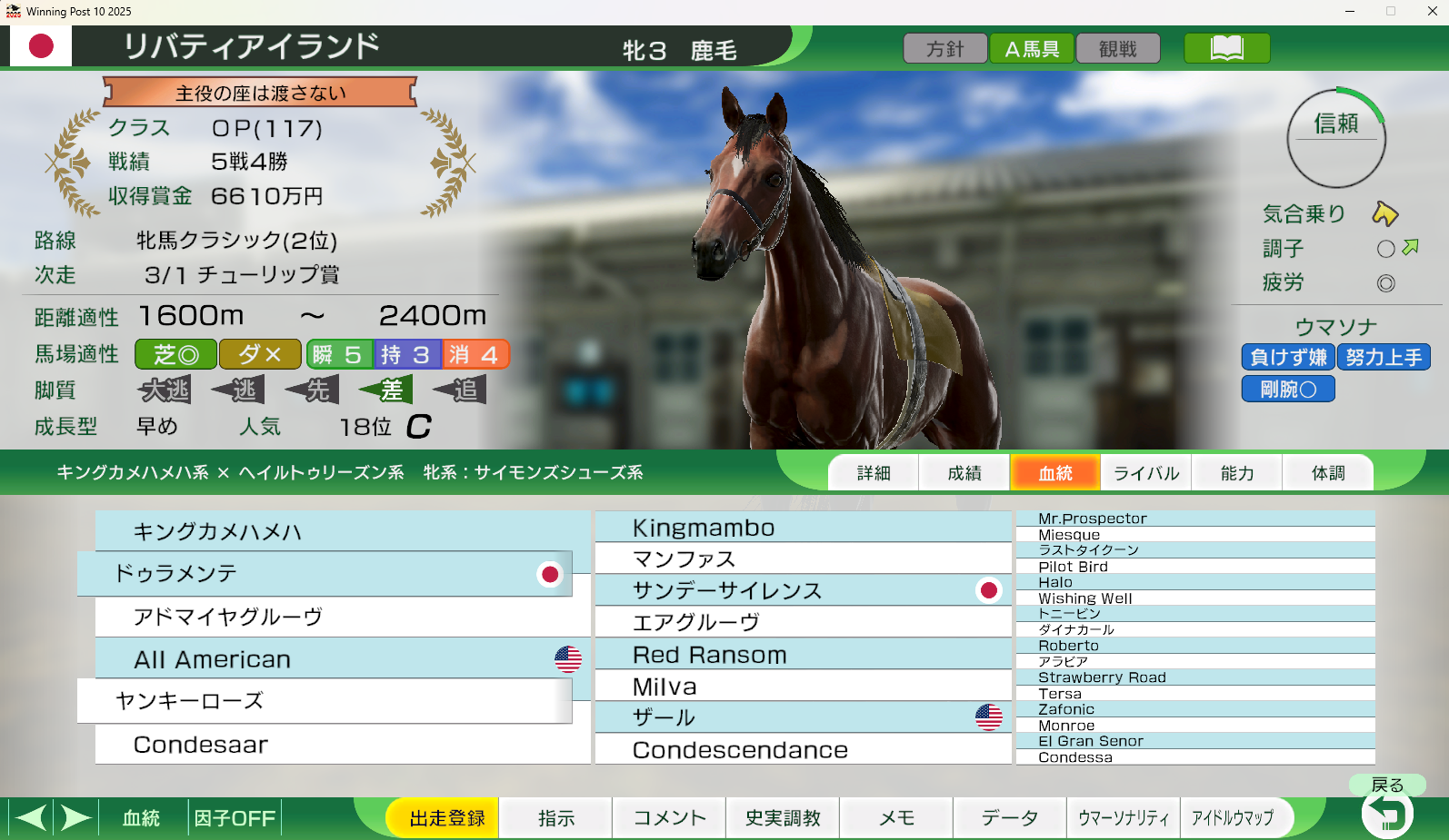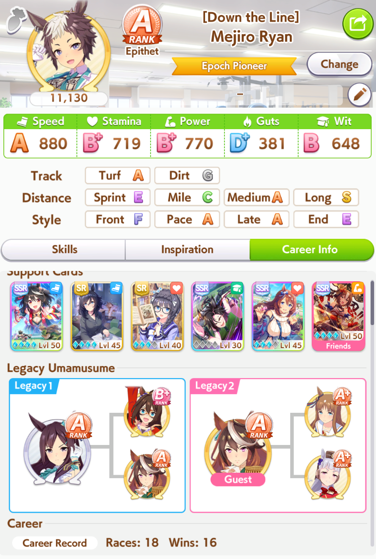 >>553760585This is my typical parent run with Ryab with triple-triple crown. She usually will randomly job one race and miss on classic triple crown, it's either random Dahby lose or lose Kikuka Sho because I didn't get ~500-600 stam and recovery skill hints.Plus another random job on random G1 race later.But her undefeated runs are also not that rare.It all hinges on me getting good stat rolls (duh) and good hints that help win, like NImble Navigator, or THH exodia. I'm pretty aggressive with buying skills, granted, if they get hints and such, but I will overspend if forced before Long races to buy full costs Swinging Maestro.