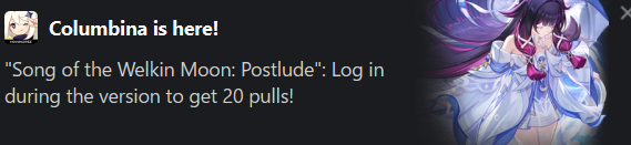 Previous: >>553743282>Character Trailer - "Columbina: To Where She Flies"https://youtu.be/WsYsNoNjbaw (EN)https://youtu.be/9AVYsSZ1huA (JP)>Character Teaser - "Columbina: Where She Dwells"https://youtu.be/ME4OGvcPBUs (EN)https://youtu.be/7zLvIrPBGF4 (JP)>Version "Luna IV" "A Traveler on a Winter's Night" Trailerhttps://youtu.be/_yuHIzPJGHA (EN)https://youtu.be/wTL5hRtmWjM (JP)>Outfit Teaser: Teyvat Style – Nocturne of Serenityhttps://youtu.be/Q5I3xKJfIO4 (EN)https://youtu.be/TGsTYPeOtxw (JP)>Current character banner: Columbina, Ineffa, Ifa, Sethos, Fischl>Current weapon banner: Nocturne's Curtain Call (Catalyst), Fractured Halo (Polearm)https://www.hoyolab.com/article/43195155>Daily check-in rewards (permanent)https://webstatic-sea.mihoyo.com/ys/event/signin-sea/index.html?act_id=e202102251931481&lang=en-us>Redeemable Codes with Primogems (all regions): https://genshin.mihoyo.com/en/giftGENSHINGIFT8X73KH58KDHNMoonInvitationLunaIV (NEW)P3GXX56W3VG9>Useful Links (Wiki, Simulators, Maps, Character Builds, /gig/ friendlist, Third-Party Tools, etc.)https://rentry.org/giglinks/gig/ OP pastebin (use this if making new thread):https://pastebin.com/ca0zseQ9