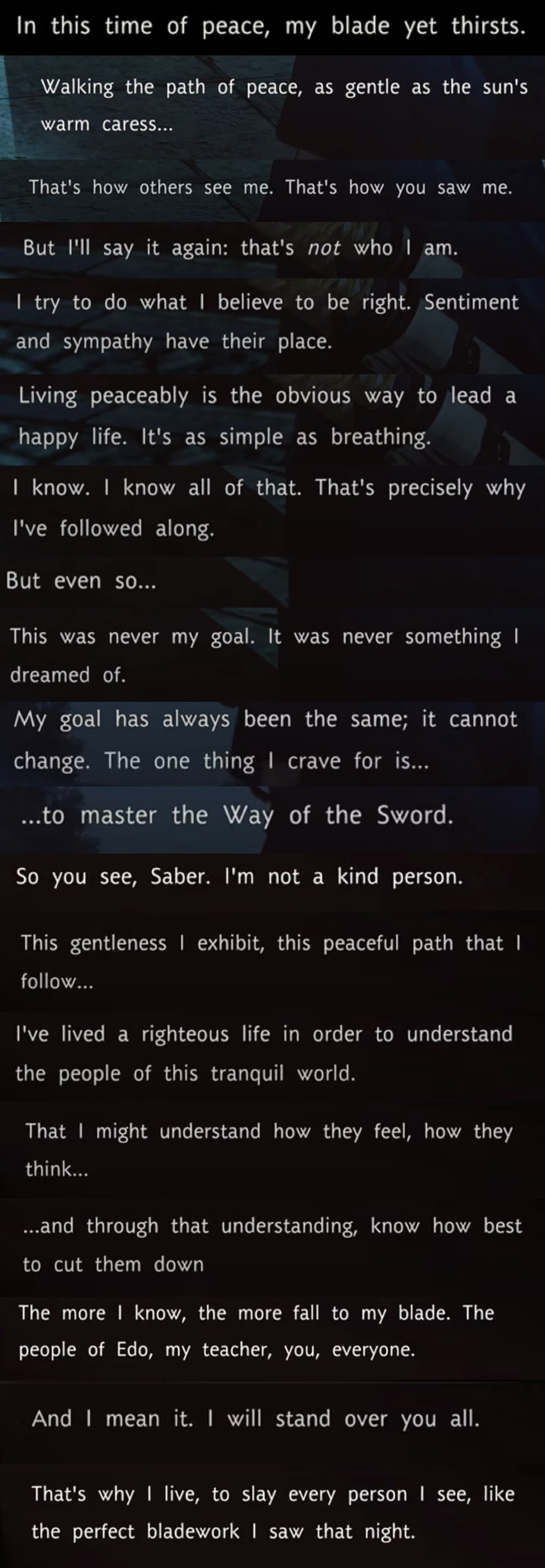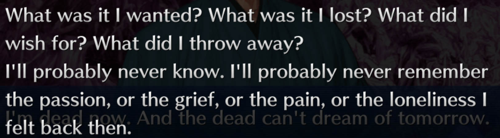Spoil me, what was Iori's wish? Something something sword autism , fight forever something? I dont regret not playing Samurai Remnant, i cant stand romanticized Japanese sword poetry.