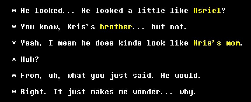 >>553795725>Ralsei is the only other character who knows the Players nameI think there's a few things hinting against thisFirstly, though the town IS called (You) Town, we don't know if Ralsei called named it that AND the guy who tells us>* Oho. Welcome to (You) Town!>* Or so I heard it's called.is the faded color Rudinn who seems tied to the Seven Flying Aces and that's its own bag of worms, and I'm like 99% sure this is the only time (You)r name is actually spoken by an in-game characterSecondly, the Darkners in (You) Town seem to generally separate (You) from Kris, like Jigsaw Joe during the tutorials>Boss!>You can ACT and SPARE on the same turn!>If you know Kris's ACT will give an enemy 100% mercy...>SPARE them on the same turn with Susie or Ralsei!So my conclusion is that either (You)r name is common knowledge among the Darkners OR Ralsei doesn't know it but the Egg Man-associated guy does