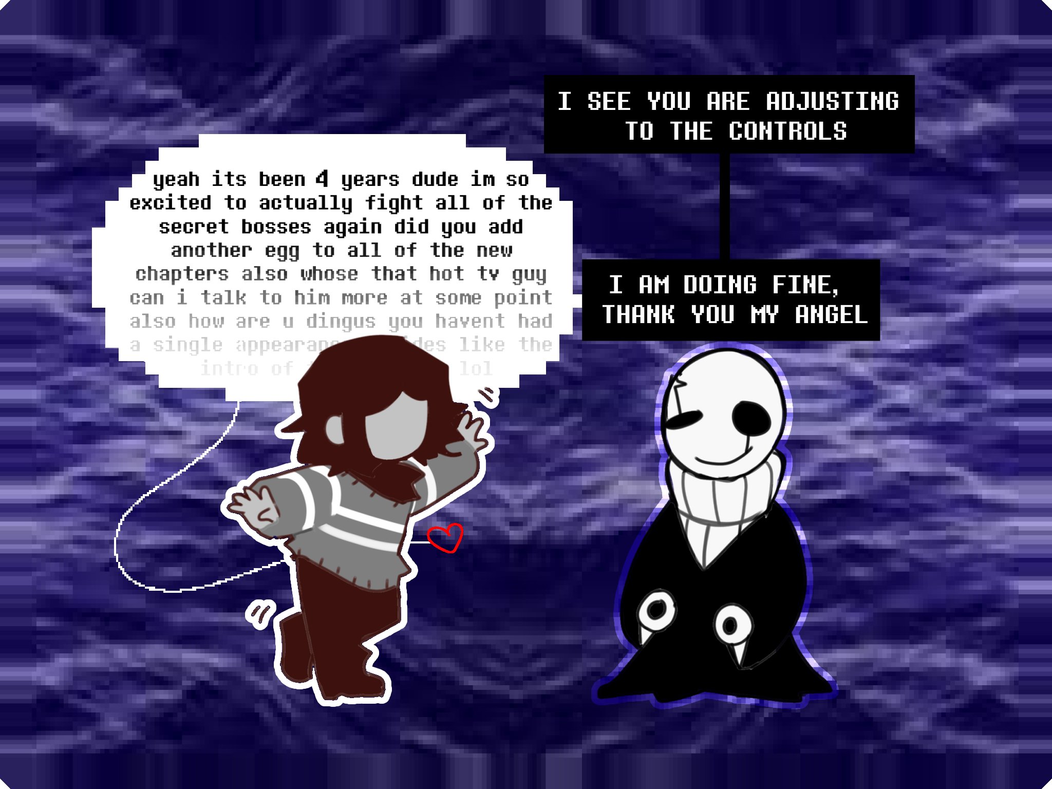 >>553795340While interesting I think that's just a limitation of game design because they can't code you being able to write your own answers to do literally anything you wantIf the Soul has a will of its own separate from everyone in a Chara like situation I'm going to honestly dislike that a lot because I did not like this in Undertale