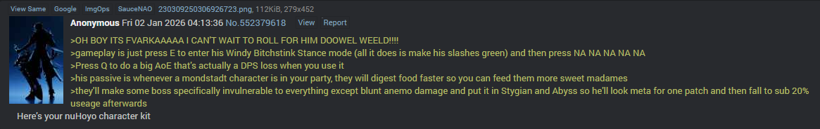 >>553793659Chink writingGenshin peaked with 2.XIt's been downhill since then, hopefully Endfield will bury it and if it doesn't then it'll still be dogshit anyway