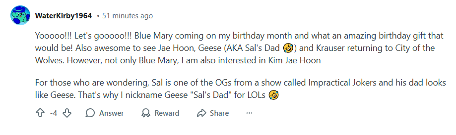 Wow! Reddit is vocal and very unhappy.https://www.reddit.com/r/Fighters/comments/1qdkg04/fatal_fury_cotw_season_2_announcement_trailer/https://www.reddit.com/r/fatalfury/comments/1qdkgb4/fatal_fury_cotw_season_2_announcement_trailer/