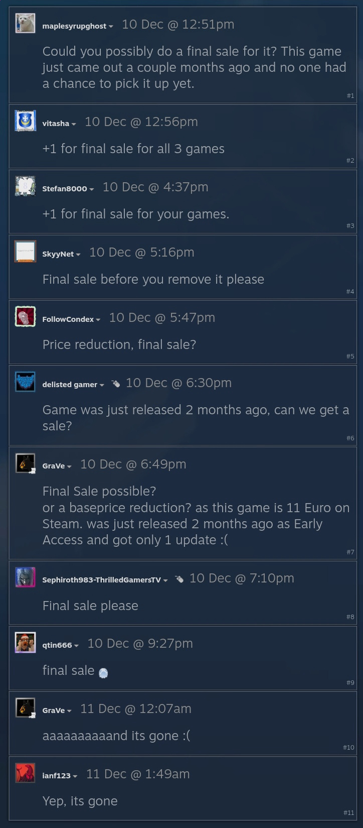 >indie dev's game flops, steamies give zero shits about it>indie dev decides to delist it>suddenly billions of steamies materialize out of thin air and they also DEMAND a discount for your gameWhat the fuck is wrong with steamies?